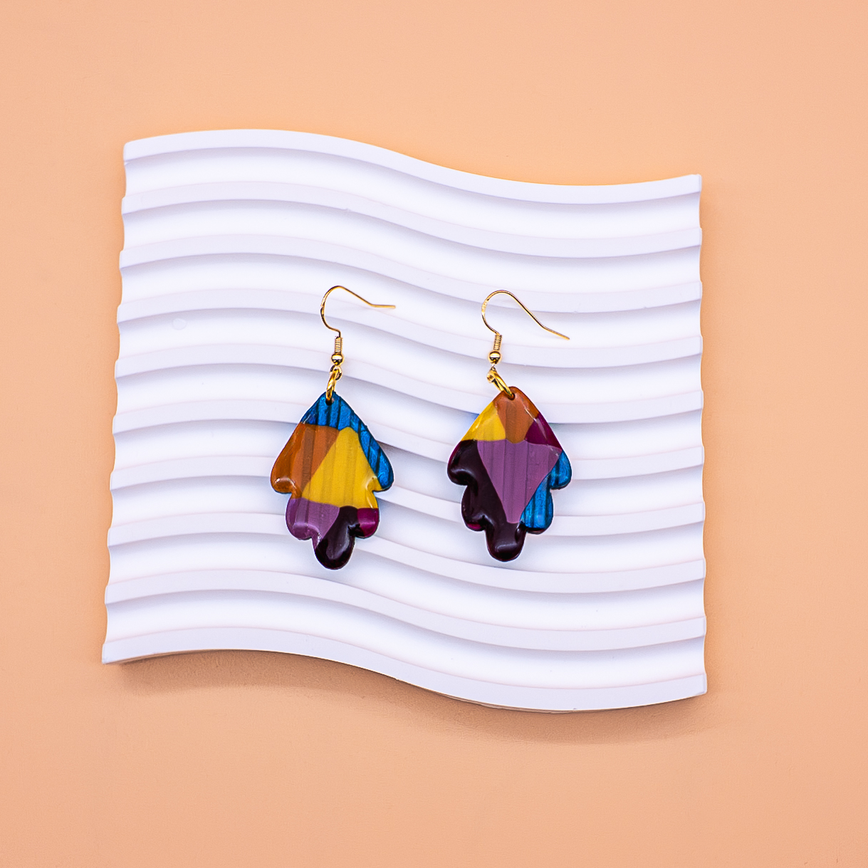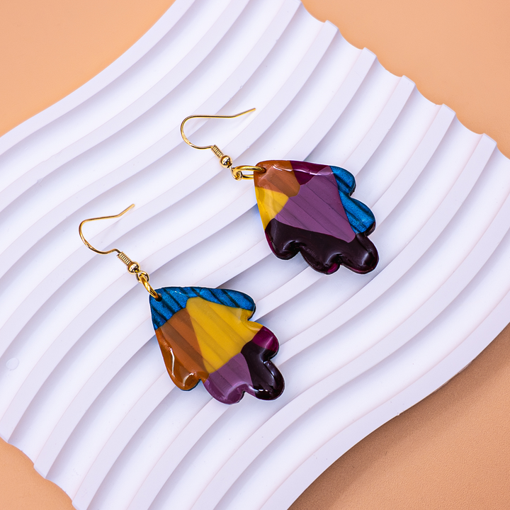 “Aurora Leaf” earrings capture the brilliance of nature seen through a kaleidoscope. Their bold leaf-like silhouettes are marbled with golden yellow, sapphire blue, rich plum, and warm amber — colors that shift like light filtering through stained glass.