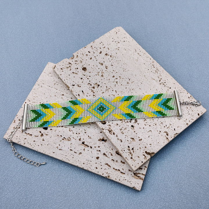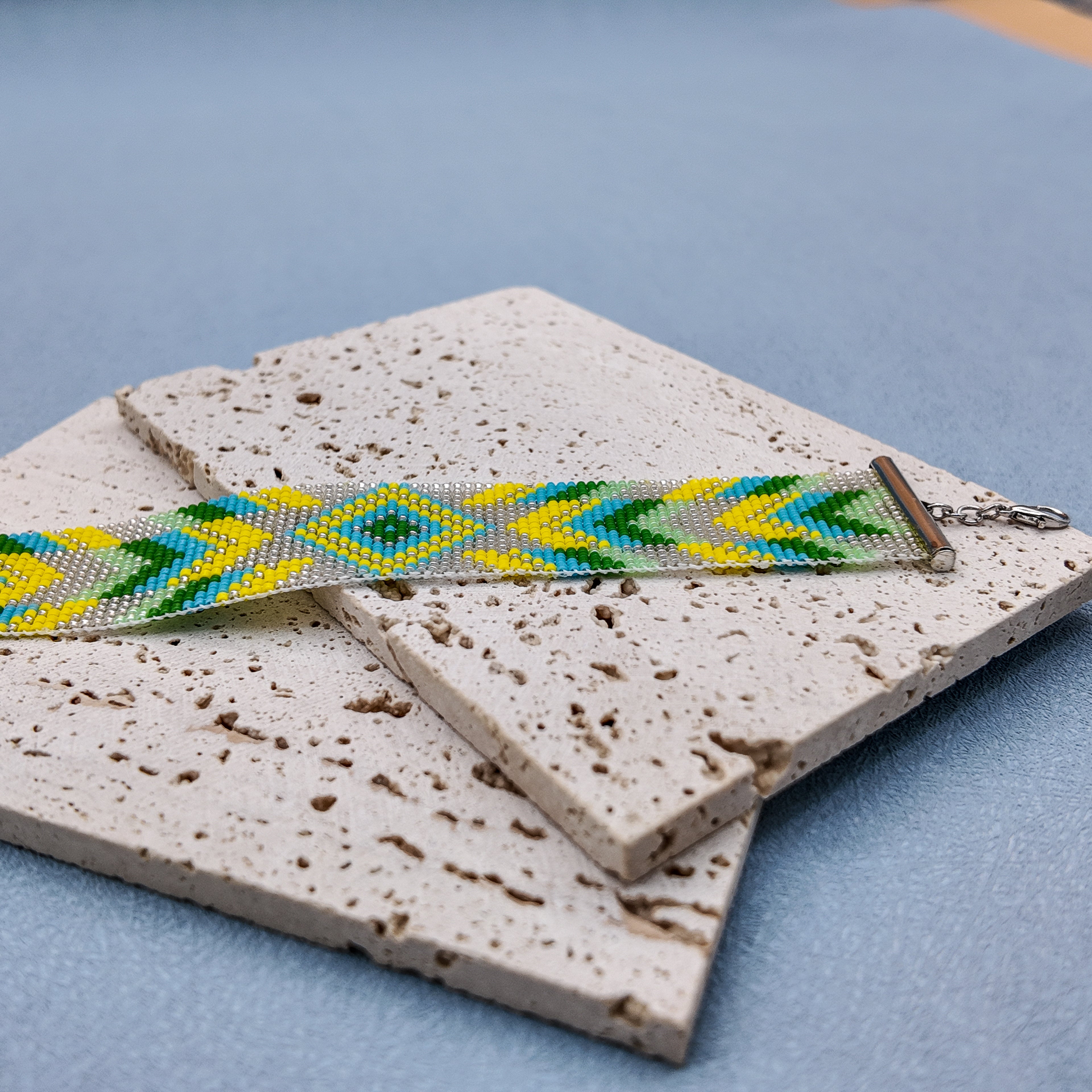 “Aurora Path” is a one-of-a-kind bracelet alive with brightness and flow. Vivid greens and yellows radiate alongside turquoise diamonds, glowing against a pure silver backdrop. Its arrowed symmetry recalls the guiding light of an aurora, handwoven bead by bead into a unique piece of wearable art.