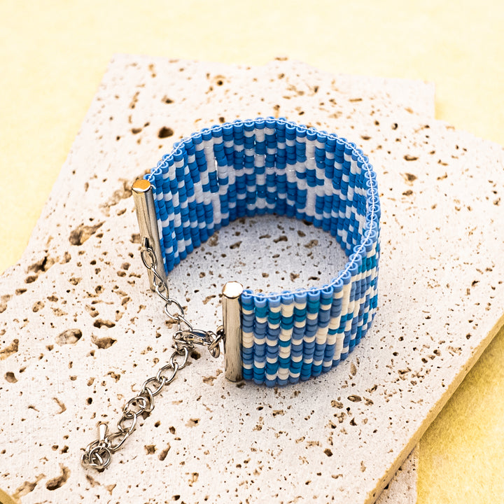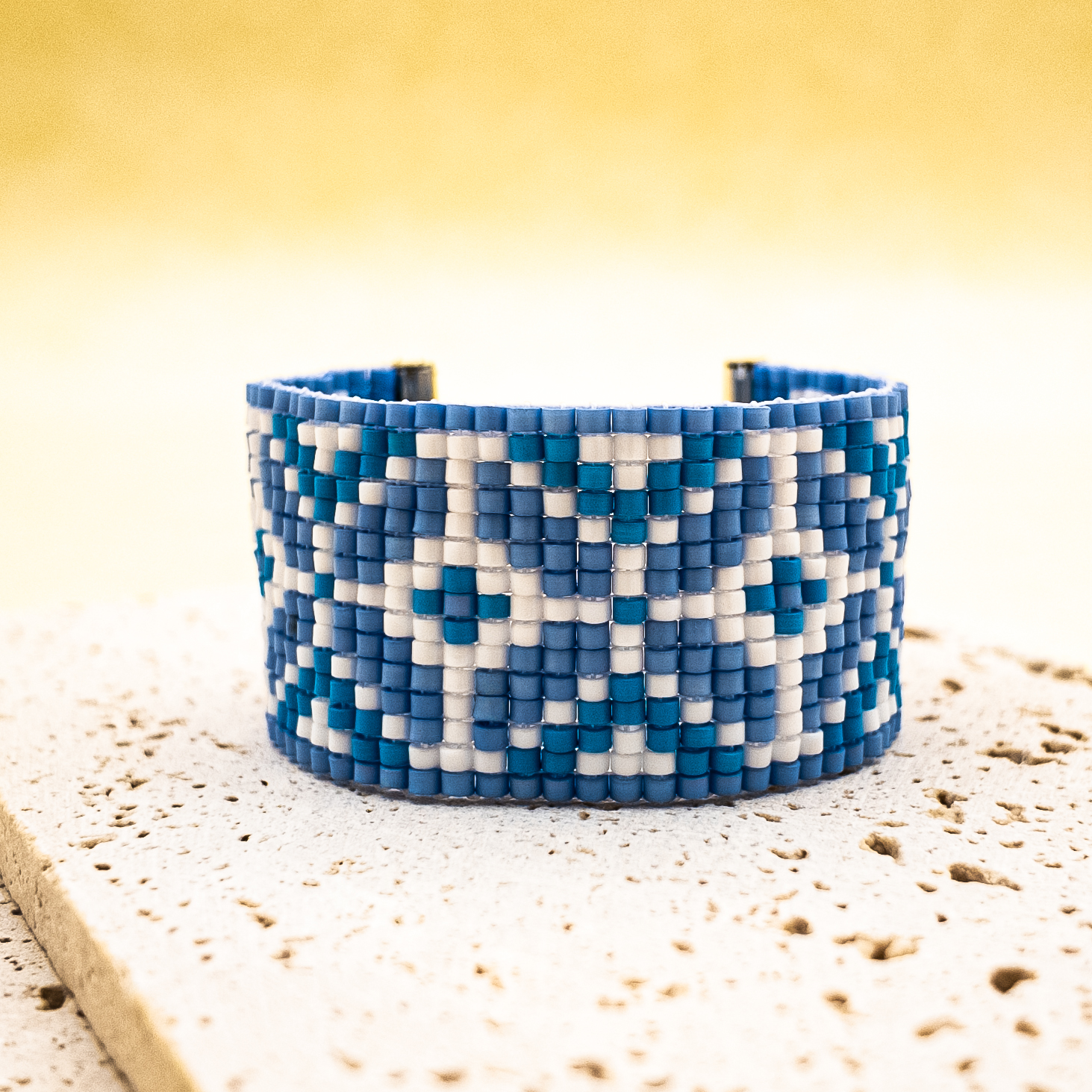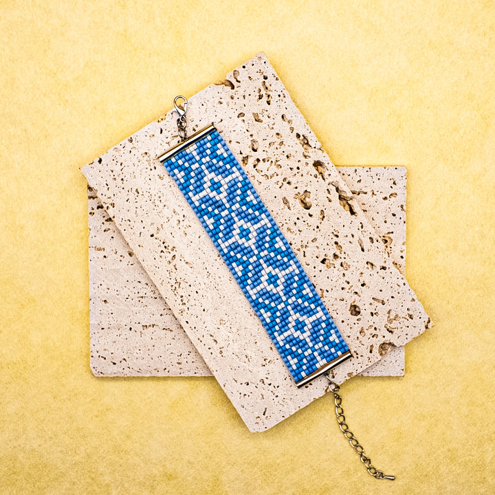 “Azure Echo” is a quiet homage to tradition — inspired by the patterns of ancient tiles, the ripple of sea over stone, and the kind of summer you can still feel on your skin years later. Woven bead by bead in varying shades of azure, white, and cerulean, this bracelet captures balance and beauty.