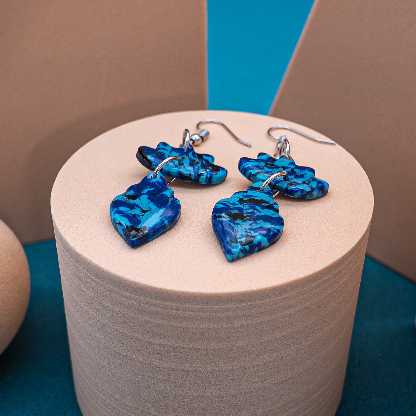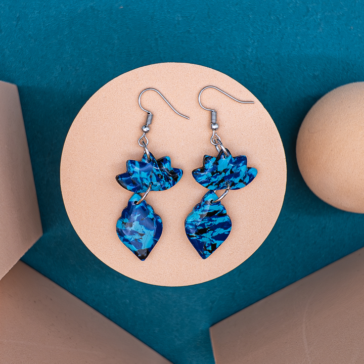 “Blue Canopy” earrings pair two abstract leaf shapes, linked together in a graceful drop that mimics the quiet sway of tree canopies. Swirled with deep sapphire, turquoise, and flecks of black, the marbled finish evokes the energy of moonlit forests and shadowed waters.