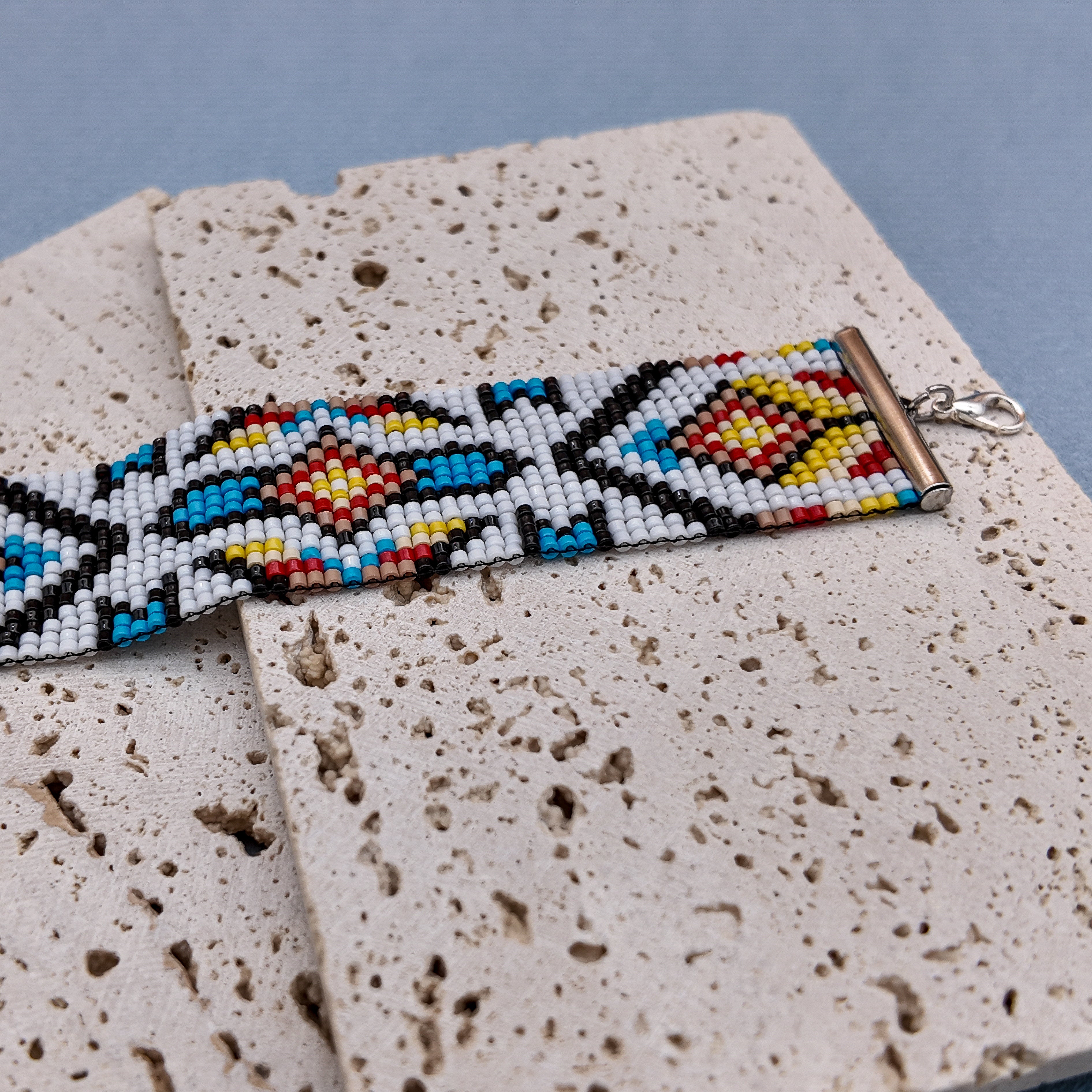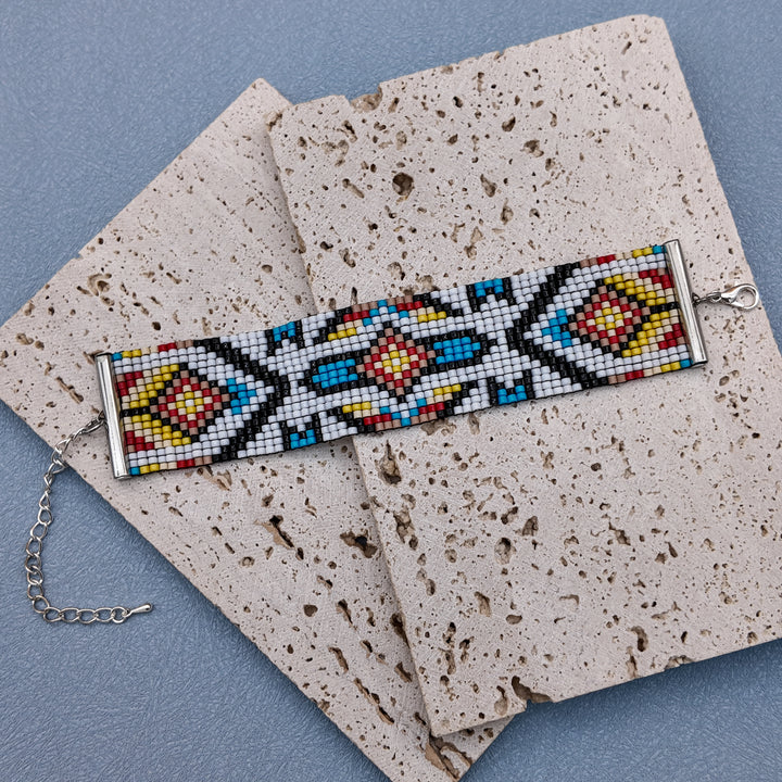 “Celestial Mosaic” is geometry alive with color — a one-of-a-kind bracelet where bold diamonds and radiant hues collide. Red, yellow, and blue burst through a crisp black-and-white frame, creating a rhythm that feels timeless and celestial. Each bead is handwoven, forming a unique piece that carries both balance and vibrancy.