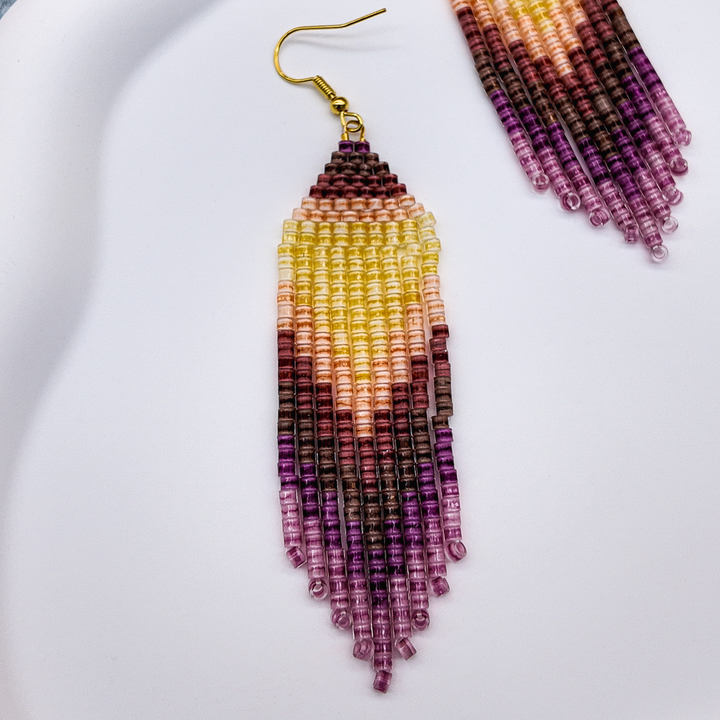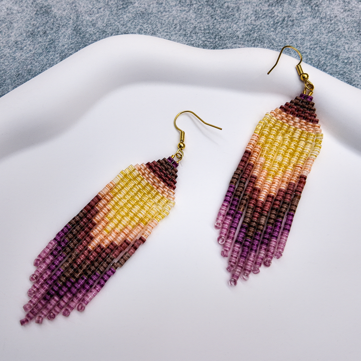 Inspired by the rich, shifting hues of desert landscapes, “Desert Mirage” brings together warm yellows, sun-bleached peaches, and deep purples to mimic the surreal beauty of sand dunes at golden hour. Handwoven with meticulous detail, each strand flows with natural ease and elegant movement.