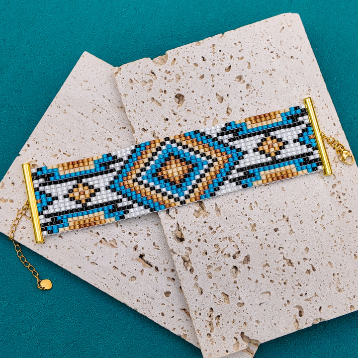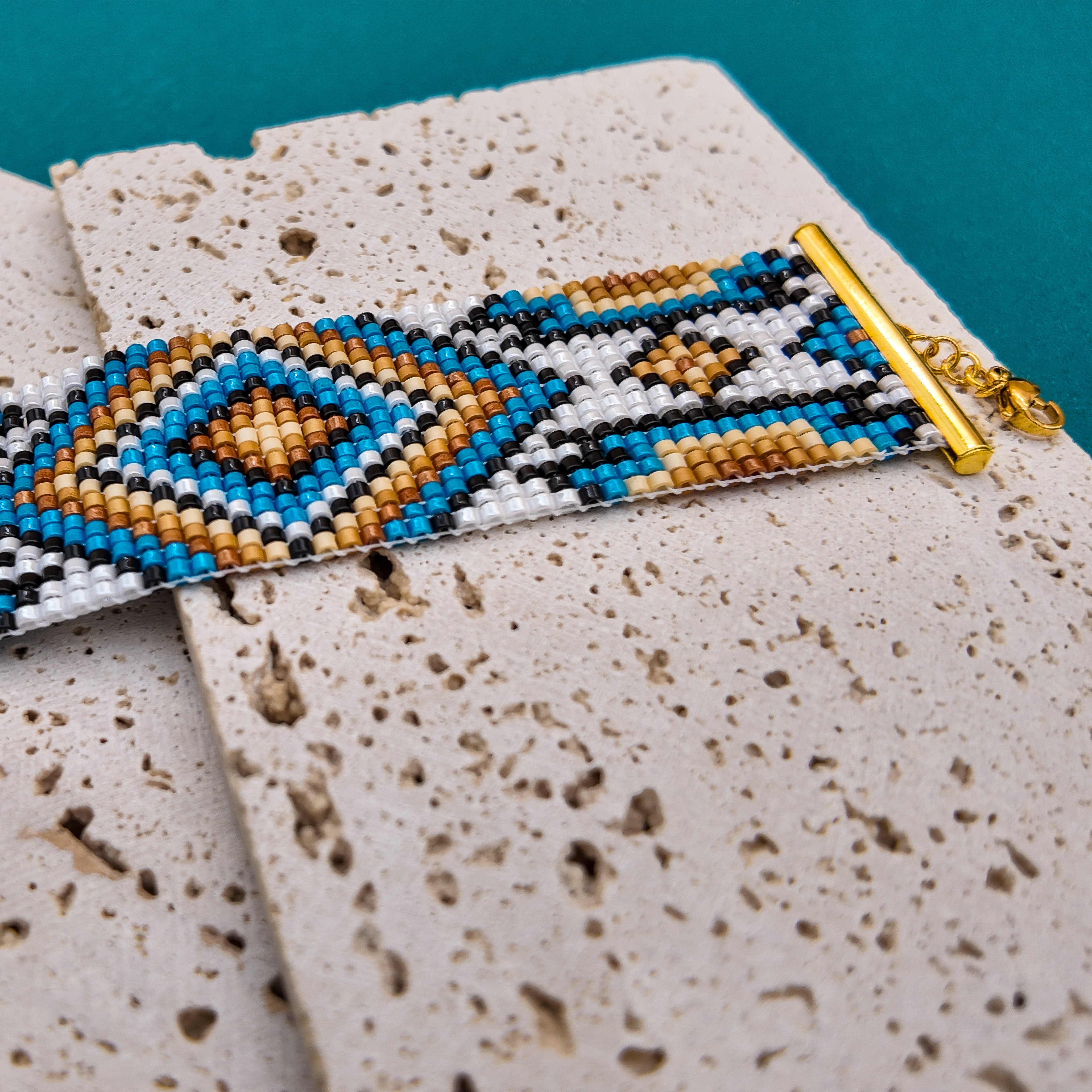 “Dune Horizon” is a meeting of earth and sky — a pattern drawn from sunlit sands and distant blue echoes. With desert brown, turquoise, and soft white flowing through bold geometric shapes, each bead is a mark of stillness, space, and subtle strength.