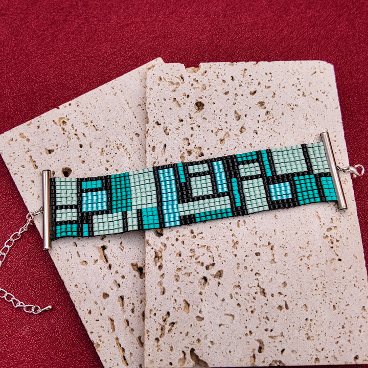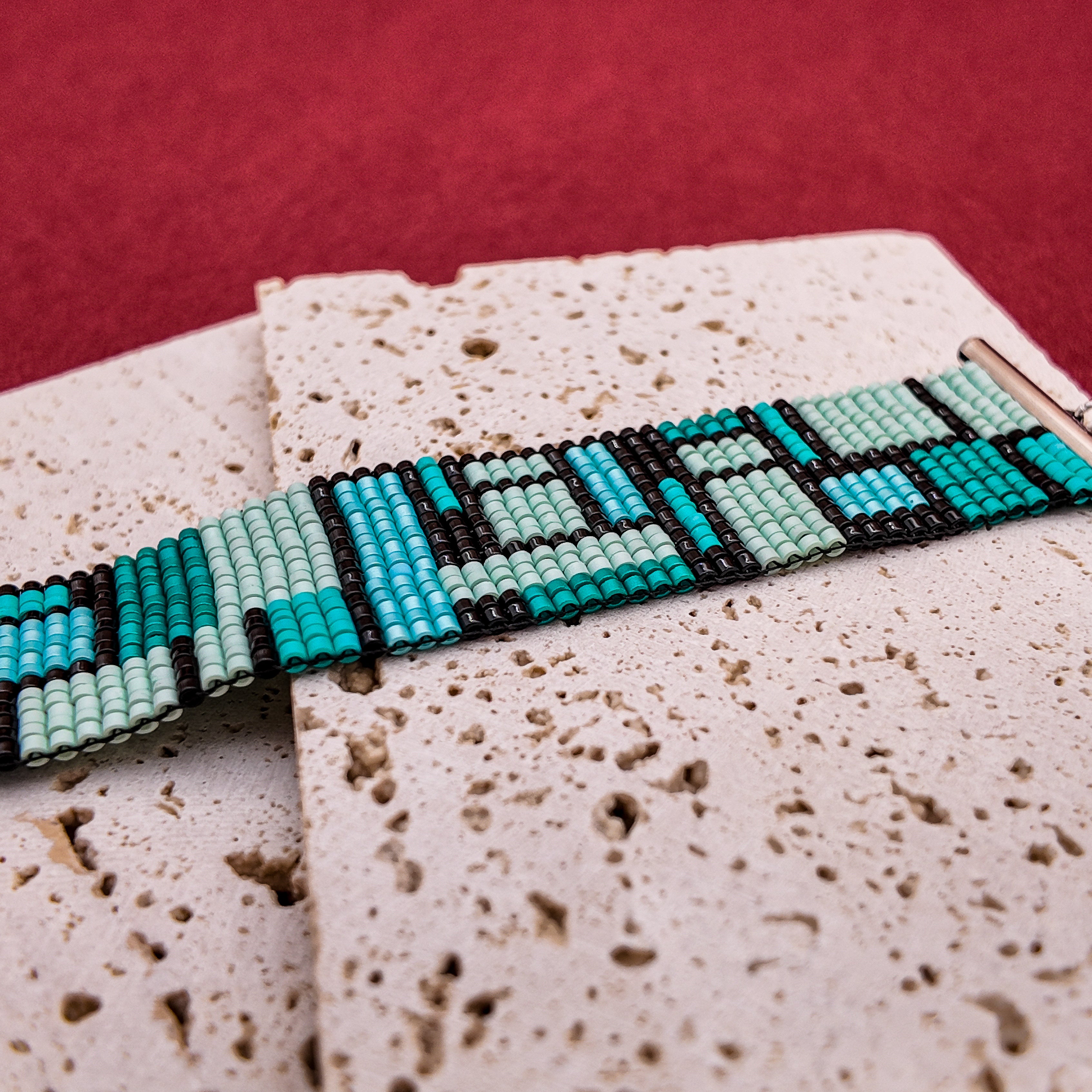 “Emerald Maze” is a path of precision — a one-of-a-kind bracelet where geometry meets flow. Cool shades of turquoise and mint are framed in bold black lines, each bead forming a mosaic of rhythm, movement, and balance.