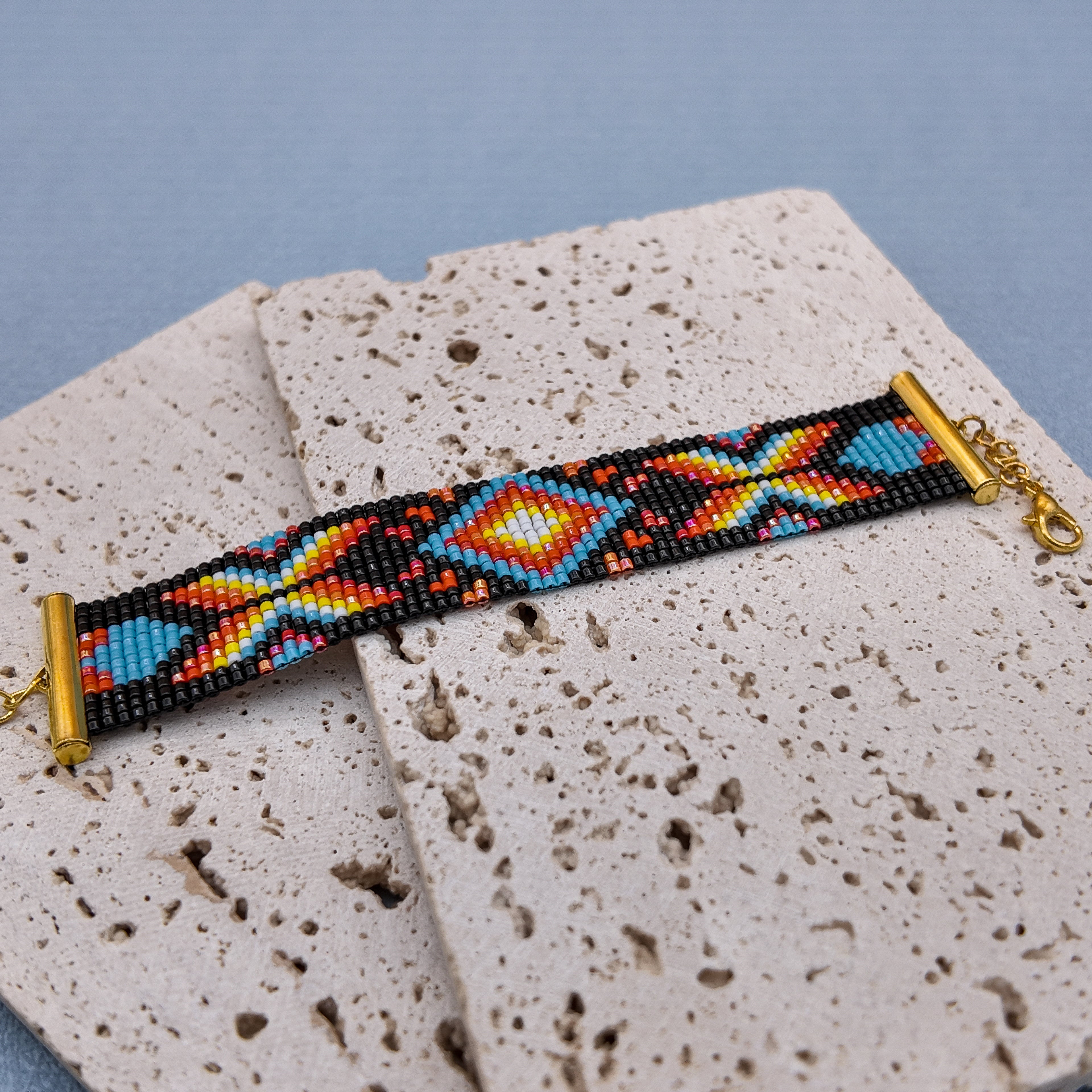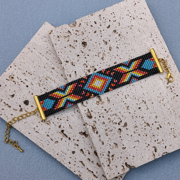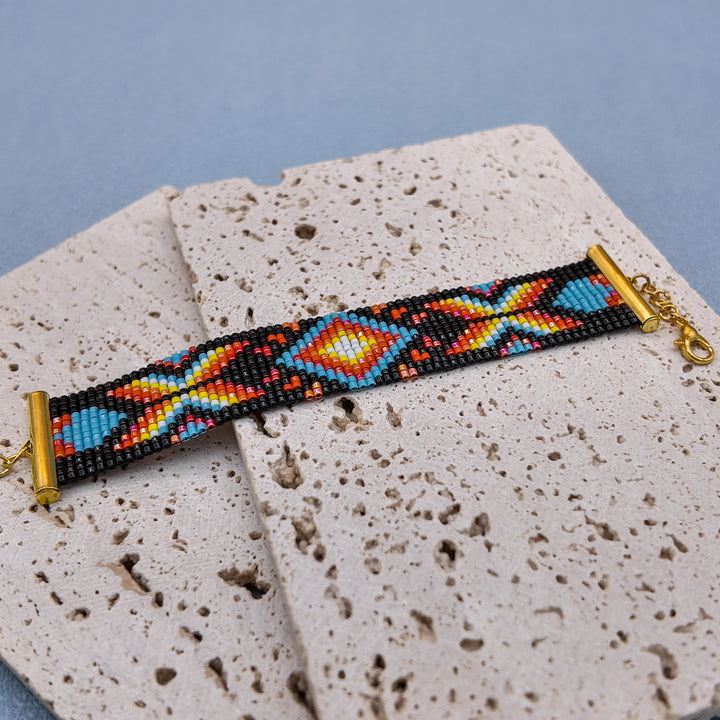 “Fire Dusk” carries the spirit of twilight — a one-of-a-kind bracelet alive with glowing embers of color. Against a deep black backdrop, bursts of turquoise, scarlet, and golden yellow form radiant star-like patterns, each bead handwoven to capture movement, warmth, and light. Bold yet balanced, it’s a piece that feels like fire meeting night.