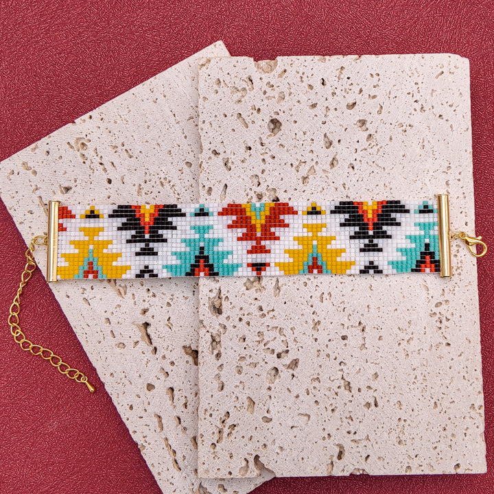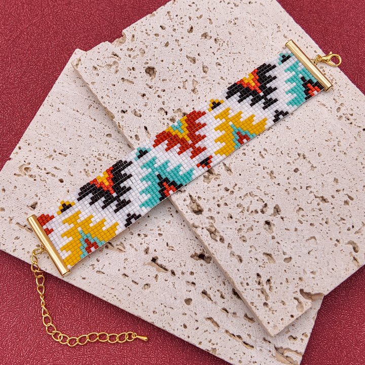 “Firebird” is flight in color — a one-of-a-kind bracelet alive with energy and spirit. With blazing reds, golden yellows, and turquoise wings unfolding across white and black, each bead captures a moment of transformation, strength, and radiant freedom.