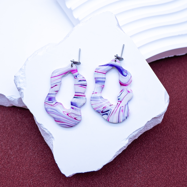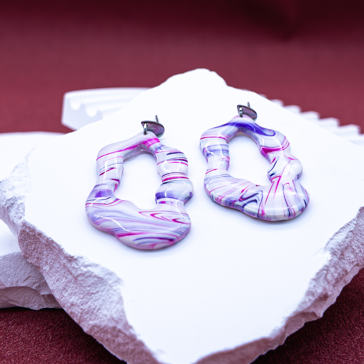 “Fluid Mirage” earrings are a tribute to movement without pattern — a reminder that beauty doesn’t always follow straight lines. With their abstract, ripple-cut shapes and flowing marbled colors, these earrings feel like a heatwave over desert sand or an ink stroke caught mid-pour.