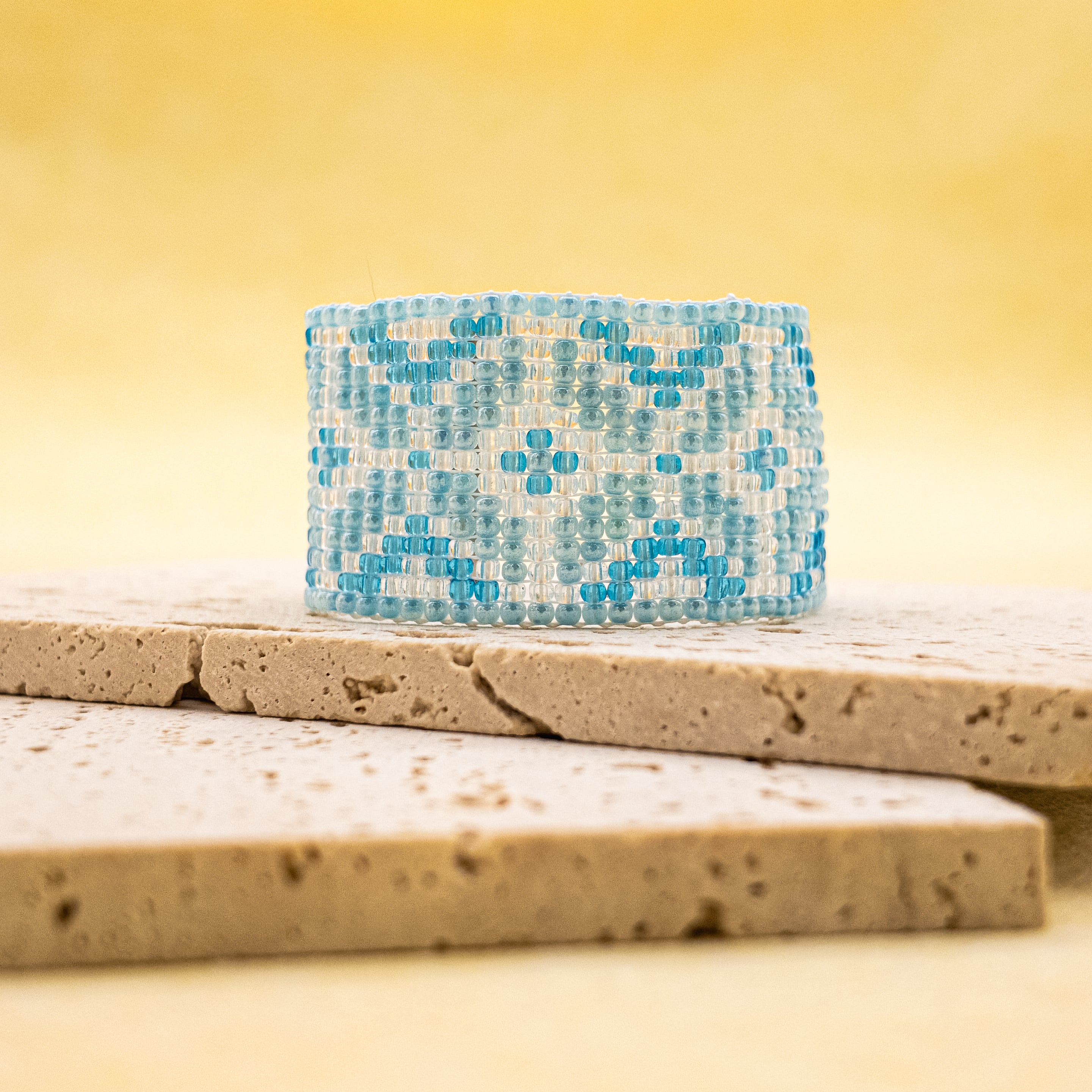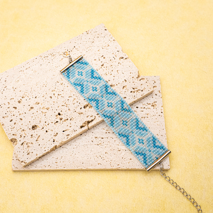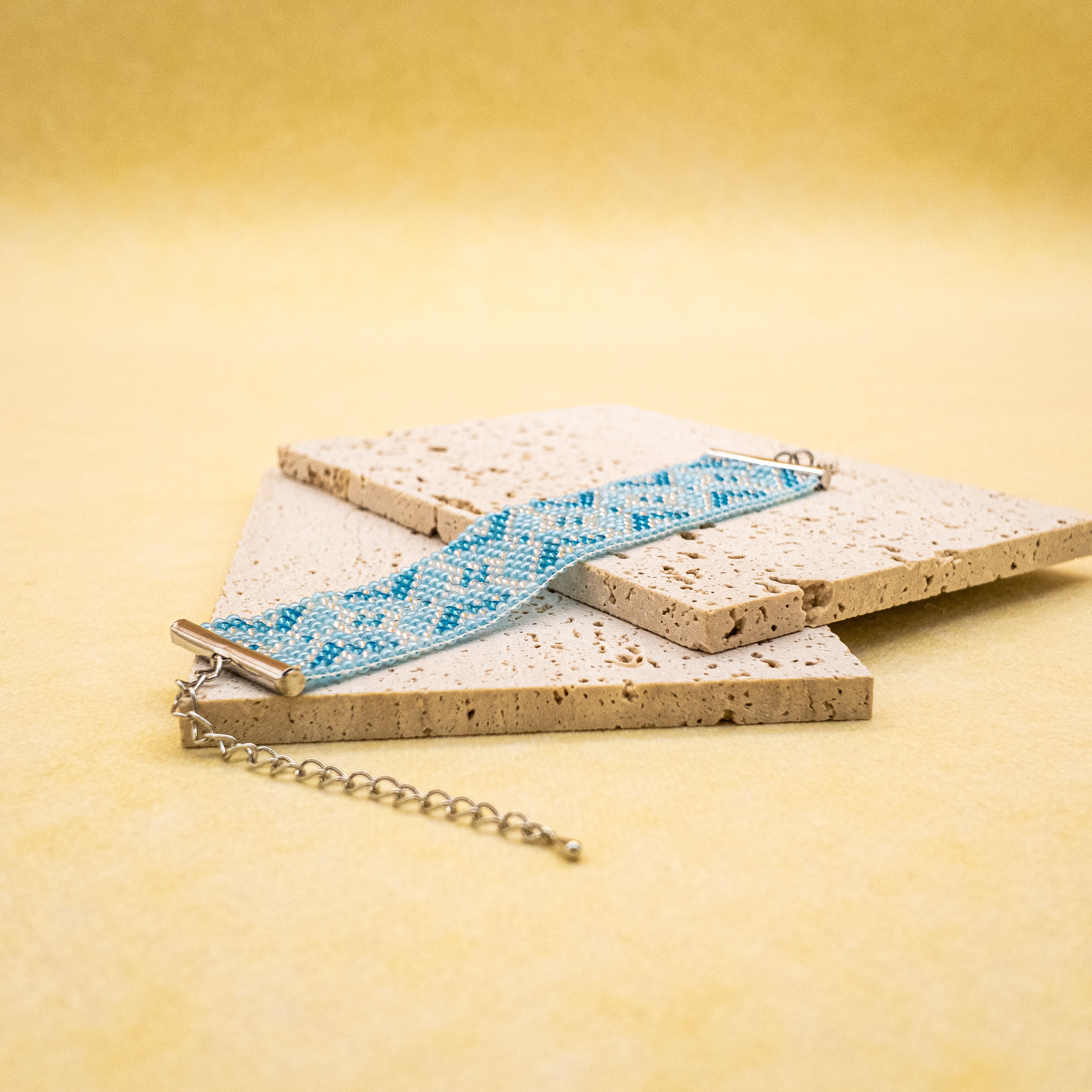 “Glacial Whisper” is made for those who find beauty in the understated — for those who don’t need to speak loudly to be seen. The design is formed from shimmering aqua and translucent glass beads, creating a pale pattern that glows gently against the skin.