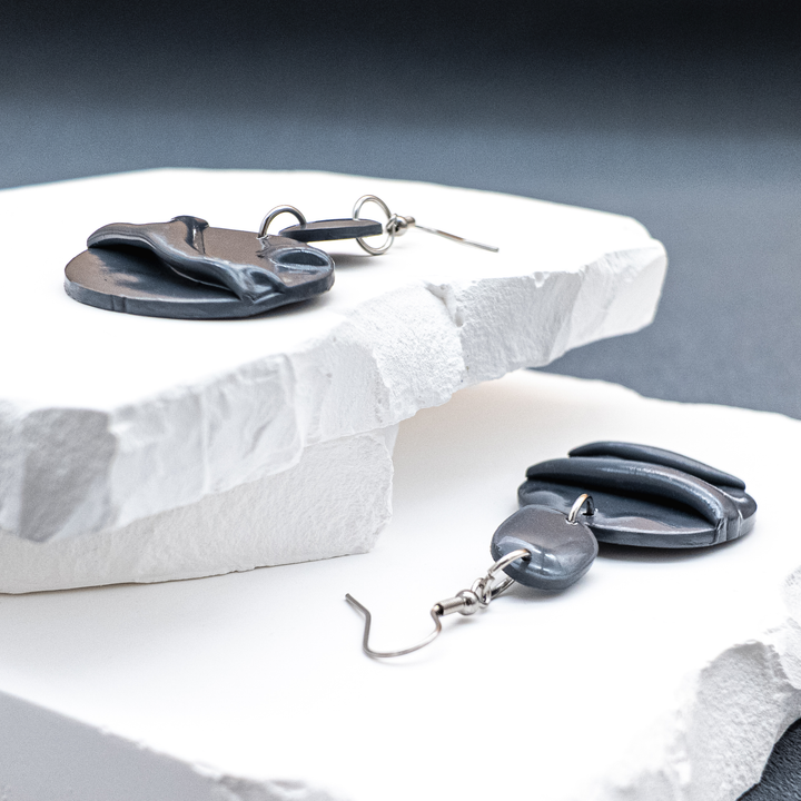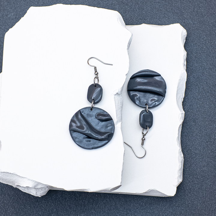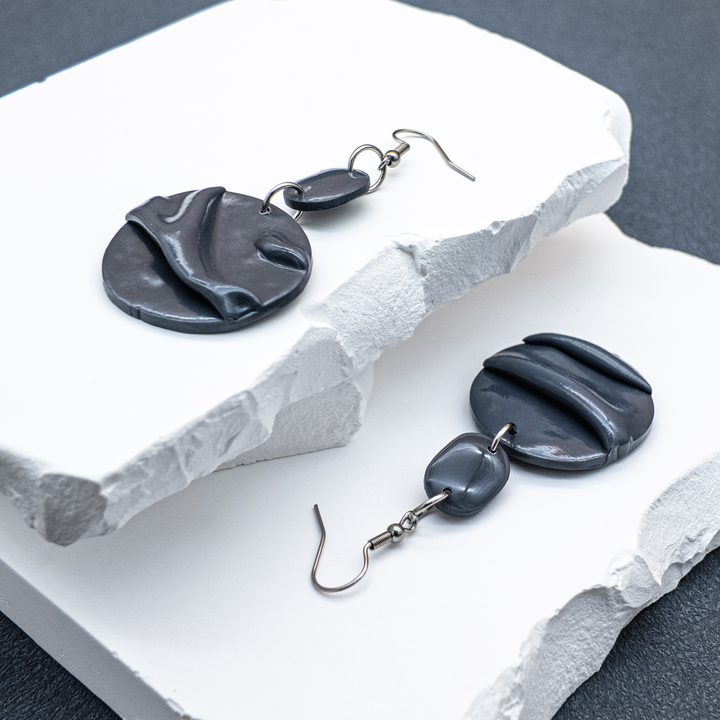 "Midnight Drape" is sculptural minimalism at its most expressive — handcrafted from deep charcoal-toned polymer clay, shaped into flowing forms that suggest motion frozen in time. Each earring is a study in contrast: softness carved into structure, elegance anchored by edge.