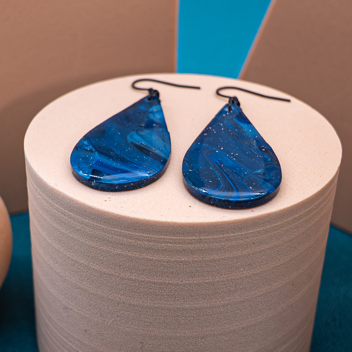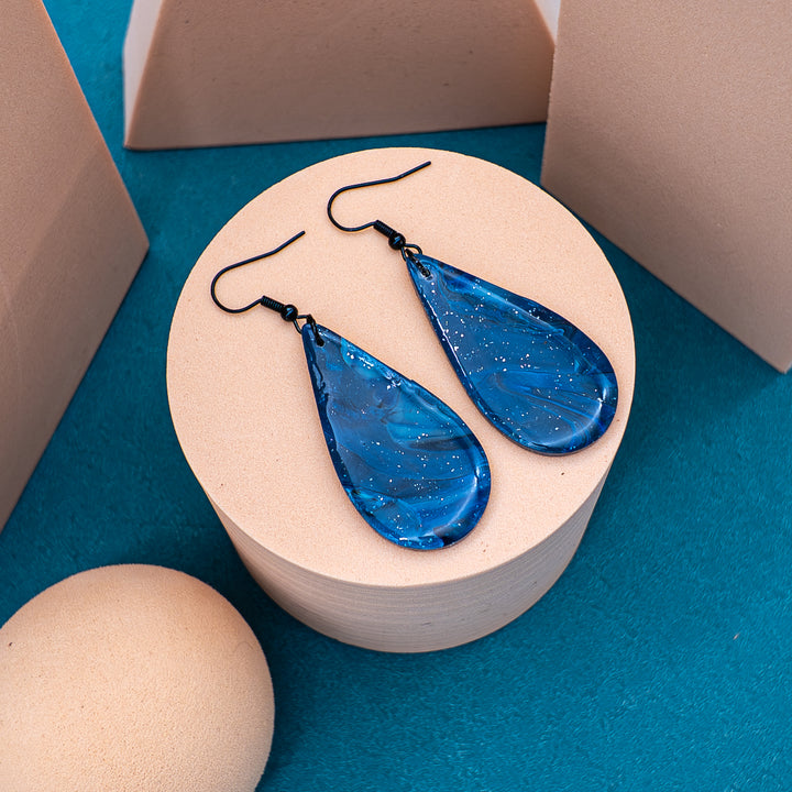 Inspired by the vastness of the night sky, “Midnight Melt” is a teardrop-shaped earring handcrafted from polymer clay, featuring a marbled blend of inky blues and blacks with glimmers of silver. The swirling pattern evokes movement — like galaxies in motion — giving each piece a completely one-of-a-kind character.