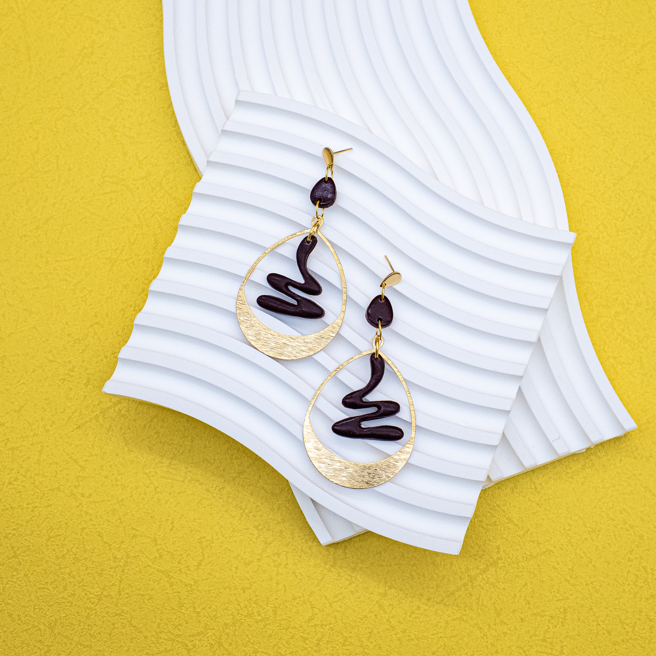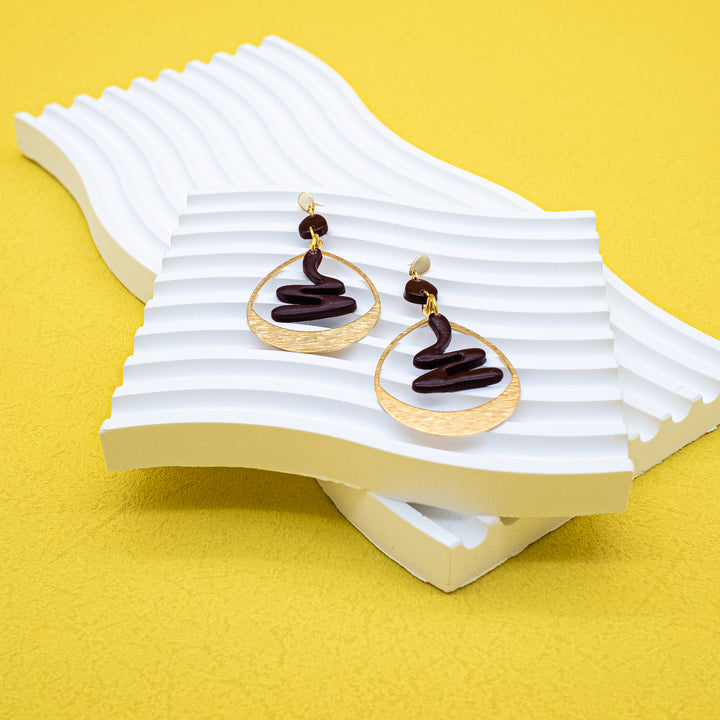 “Molten Muse” is a visual echo of nature’s most powerful transformation — molten rock becoming solid form. Deep maroon clay flows in an abstract swirl, suspended within textured gold-toned teardrop frames.