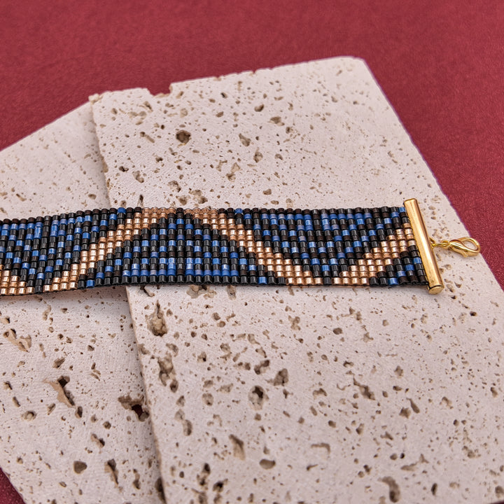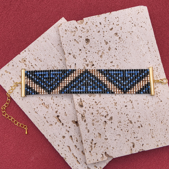 “Nocturne Rise” is geometry in motion — a one-of-a-kind bracelet shaped by shadow and light. Metallic bronze triangles climb through midnight blue and black, each bead forming a rhythm of ascent, elegance, and quiet strength.