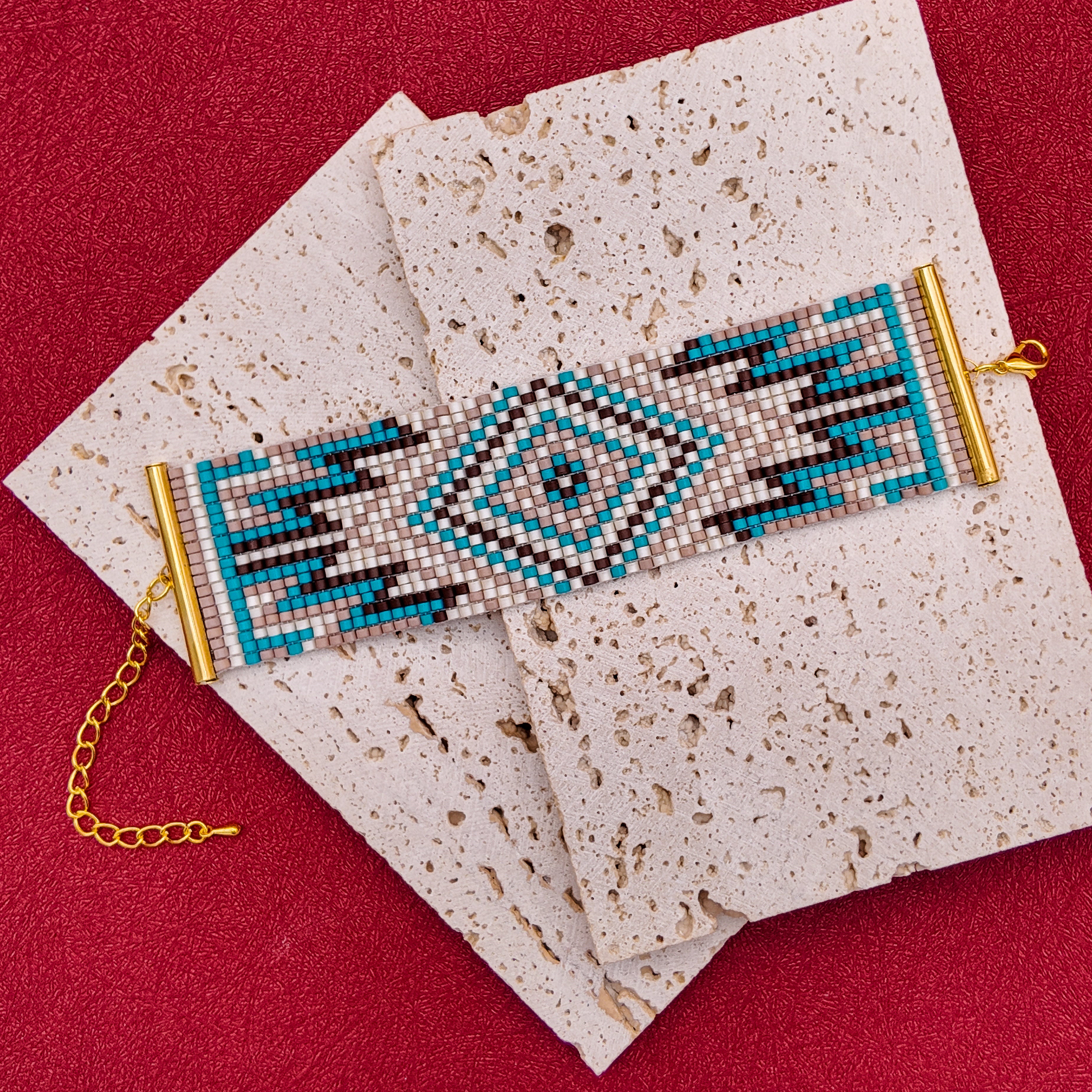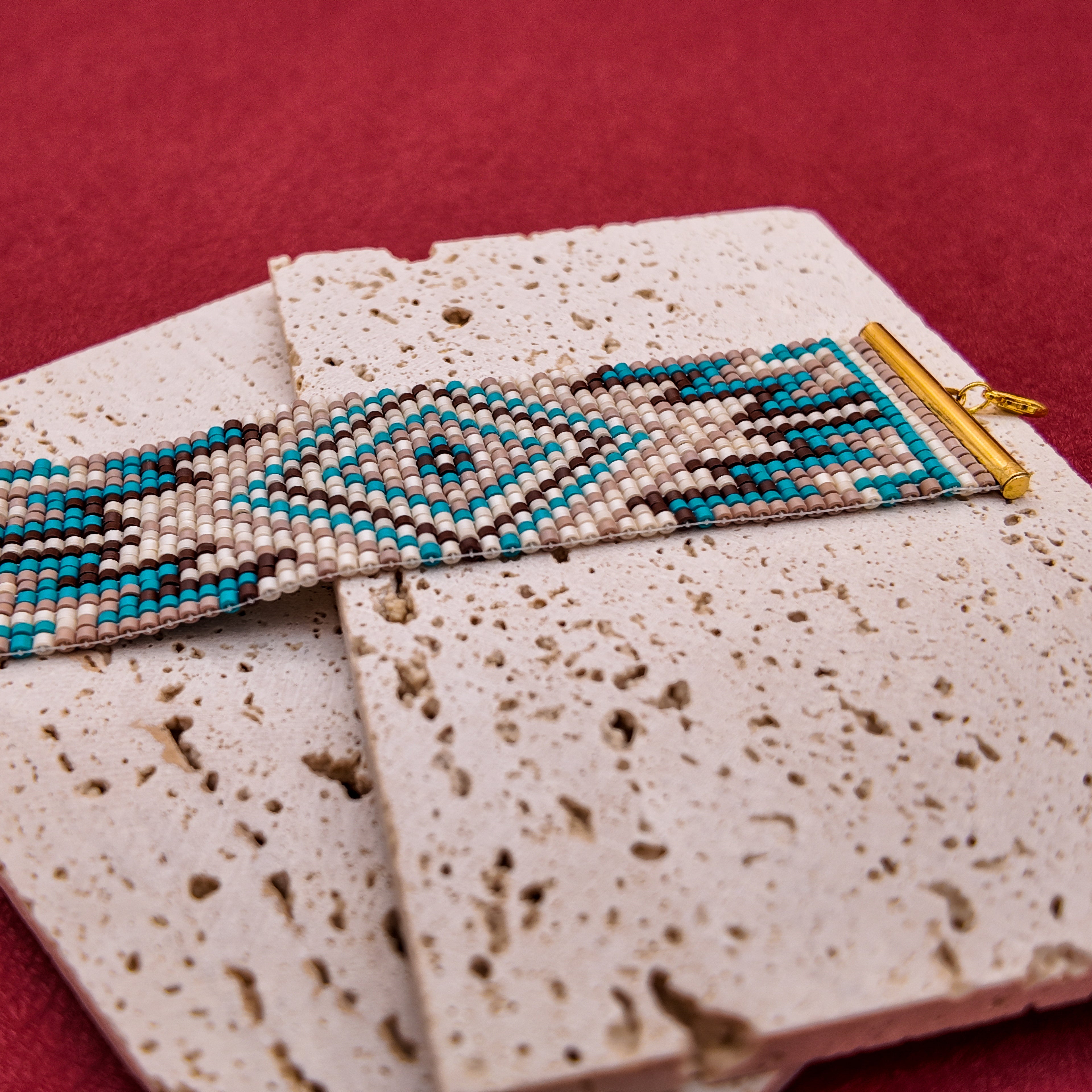 “Oasis Echo” is stillness in design — a one-of-a-kind bracelet where sand and sky meet. With gentle beige tones, deep browns, and vivid turquoise diamonds rippling outward, each bead reflects calm, balance, and the quiet rhythm of desert waters.