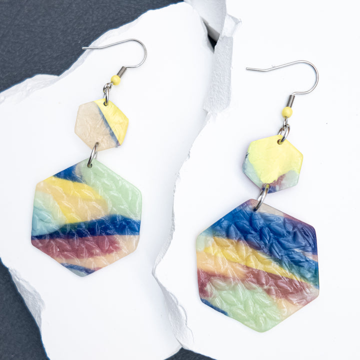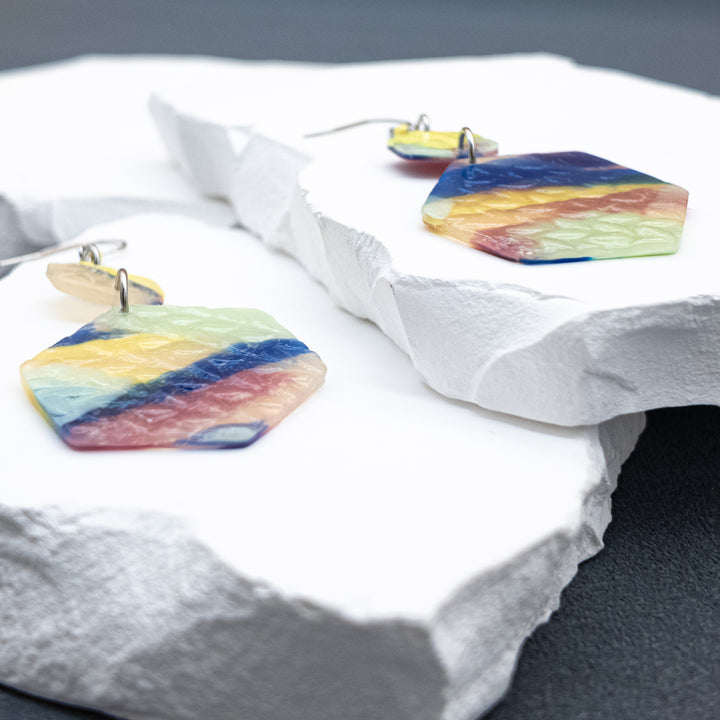 "Prism Drifter" blends the clean edges of geometric shapes with the soft unpredictability of swirling, translucent color. Streaks of blue, rose, citron, and seafoam layer like light bending through mist — each line fluid, each texture subtle.