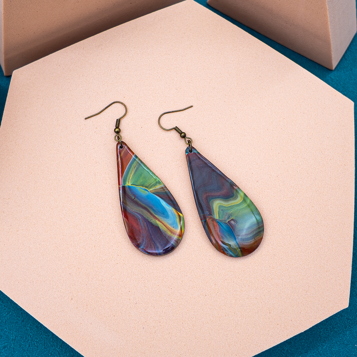Drenched in deep swirls and layered hues, “Prism Drop” brings a painterly touch to your look. Each teardrop shape is alive with shifting colors — like a reflection on water, or the trail of a dream you almost remembered.