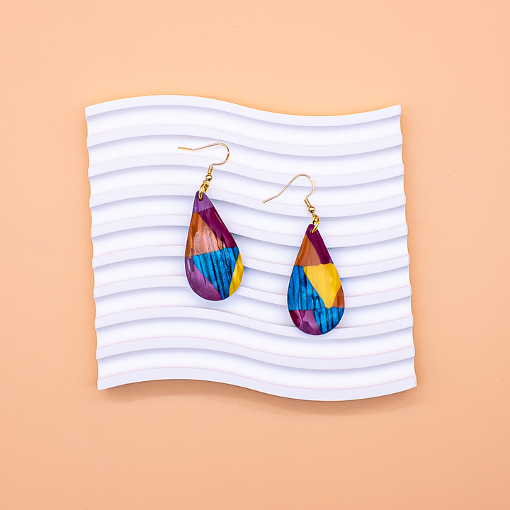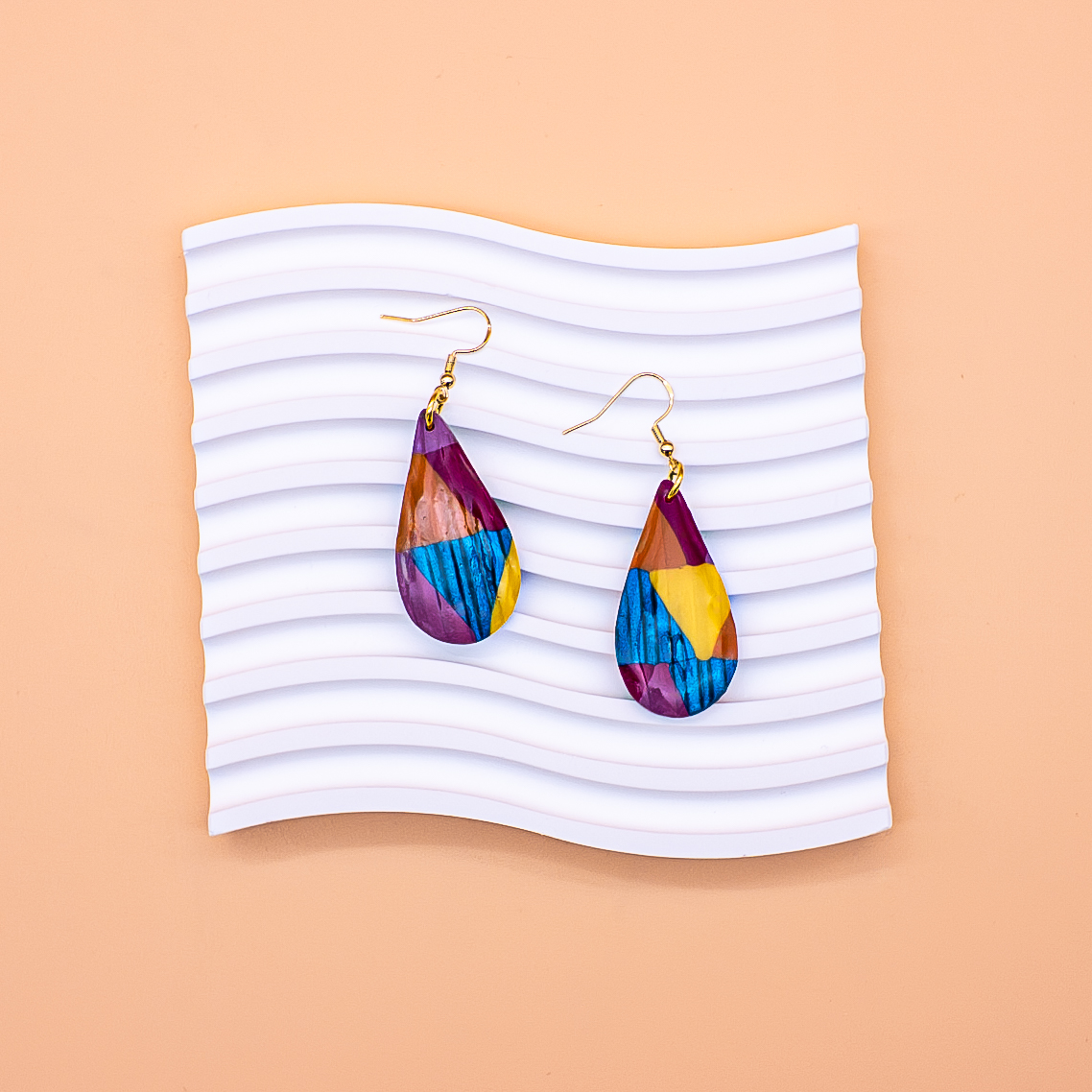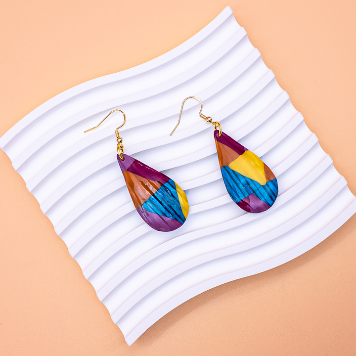 “Aurora Shards” earrings are a celebration of color in motion. Their elongated teardrop silhouettes are marbled with vibrant planes of sapphire blue, golden yellow, deep plum, and copper — a patchwork of jewel tones that catch the eye like shards of stained glass.