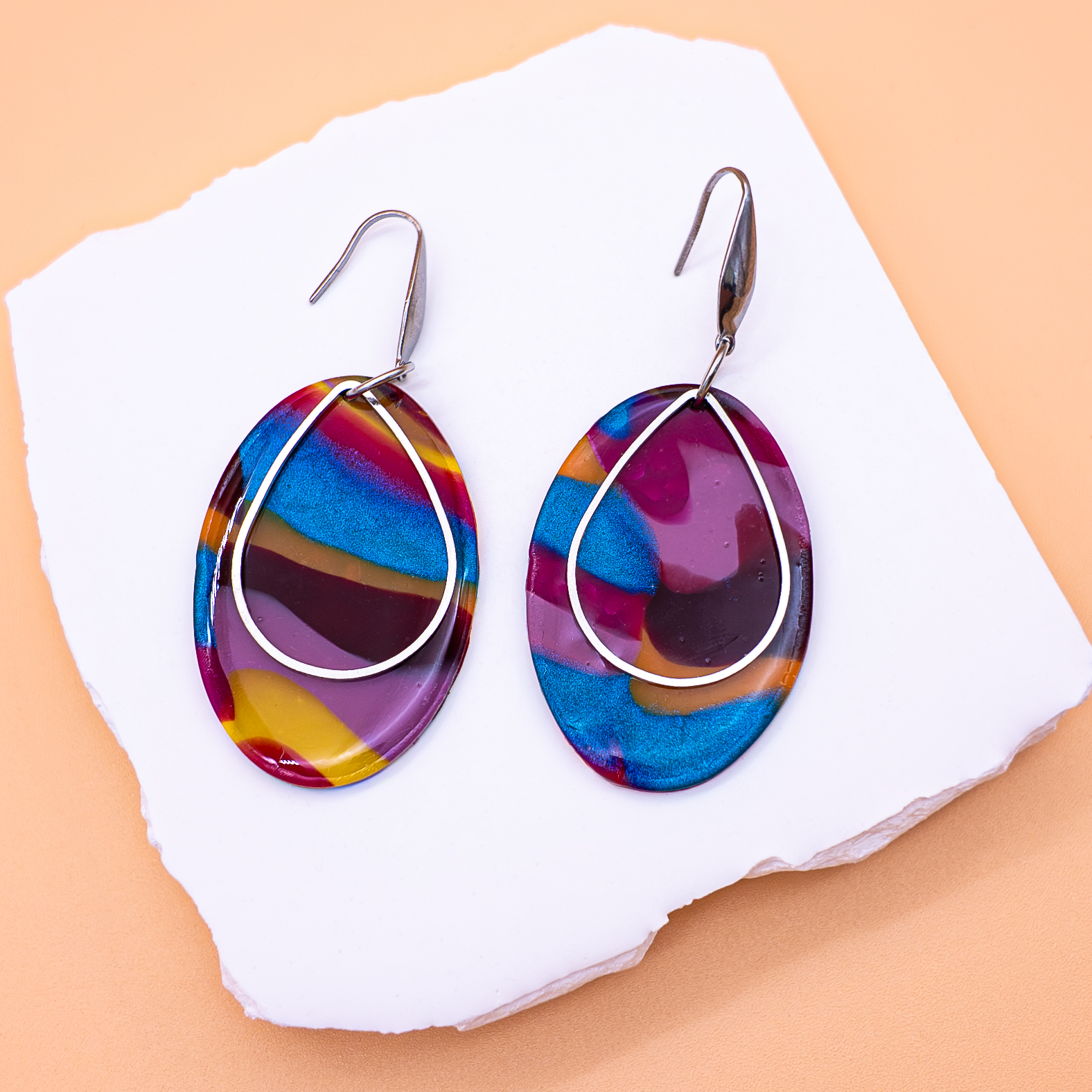 “Prism Loop” earrings are a fusion of bold color and modern elegance. The marbled ovals carry layers of sapphire blue, crimson, violet, and sunlit yellow — like fragments of stained glass brought to life. Framed by a minimalist silver loop, the design strikes a balance between organic flow and geometric precision.