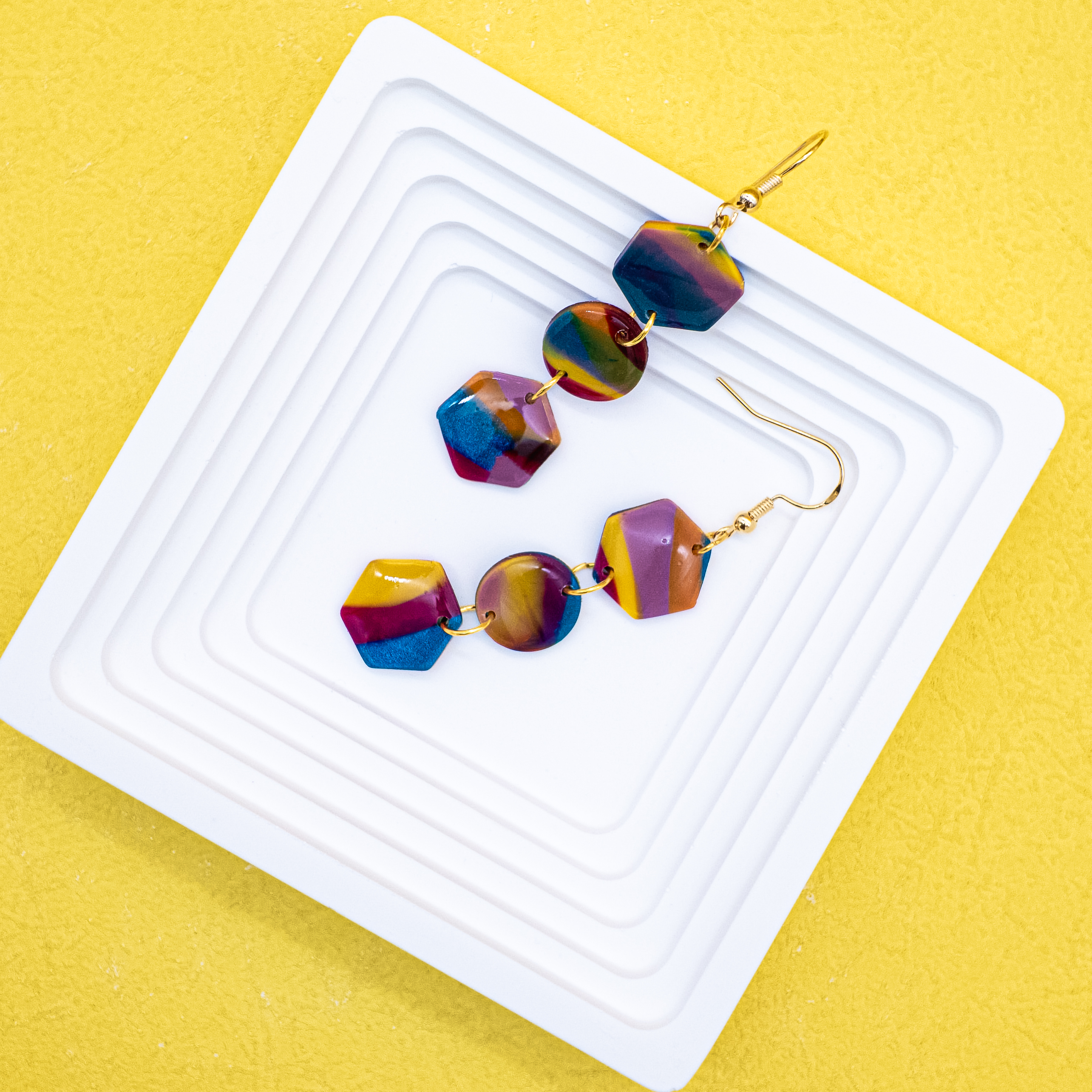 With a vibrant fusion of hexagons and circles, "Prism Parade" is a bold expression of playful structure and chromatic flair. These lightweight polymer clay earrings boast streaks of magenta, mustard, cyan, and violet — each shape seamlessly melting into the next like tiles in a stained-glass mosaic.