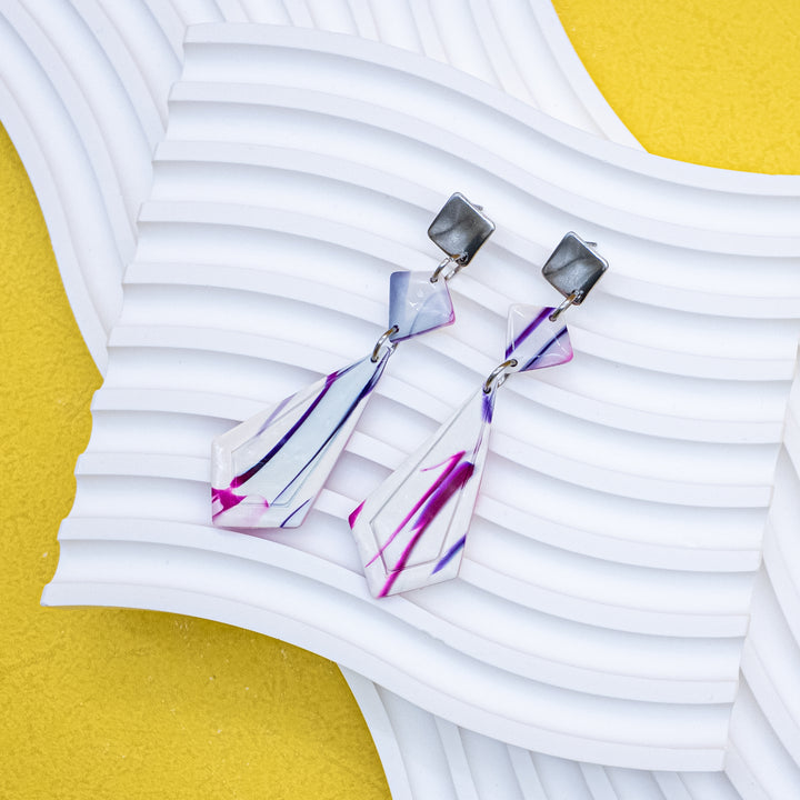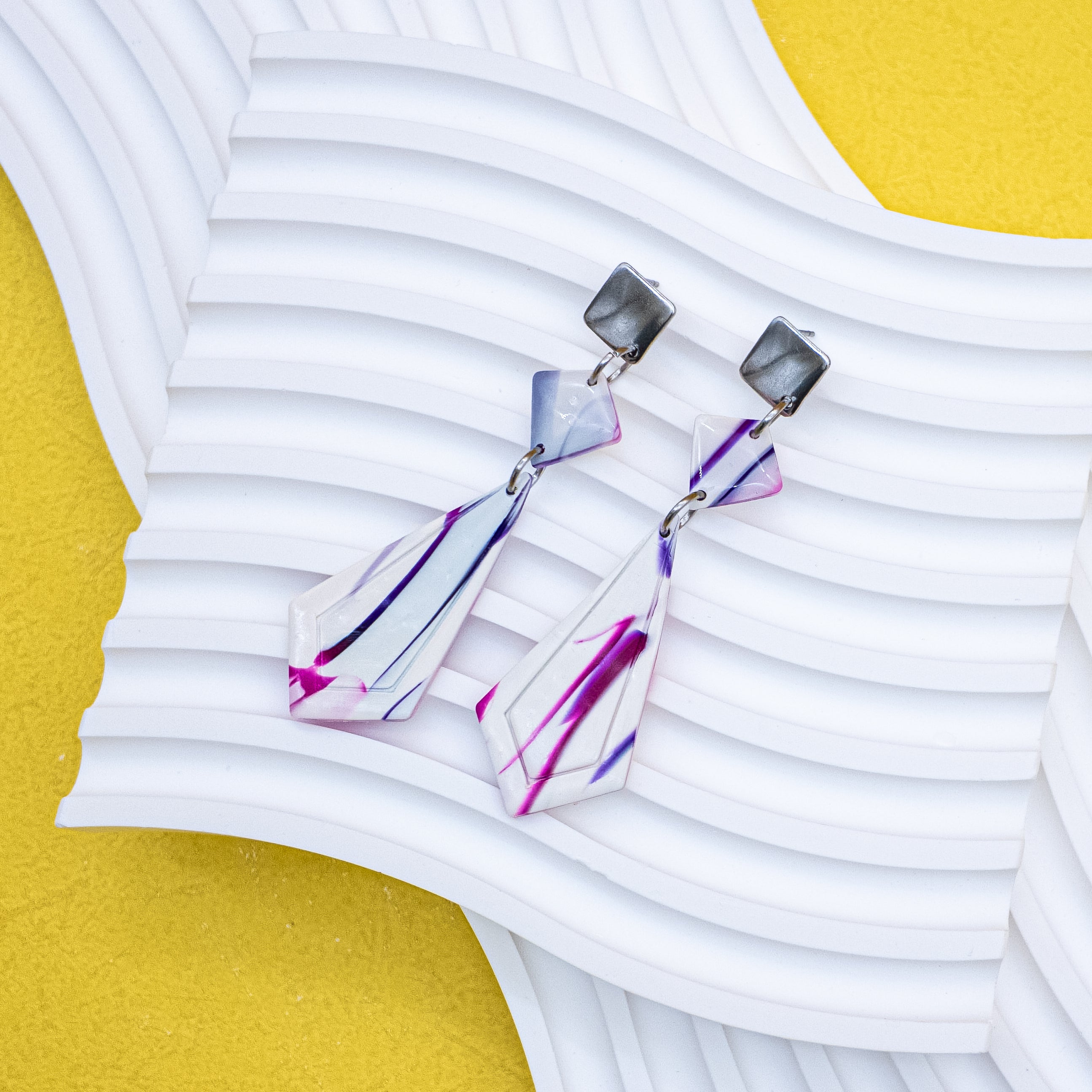 “Prism Pulse” was designed to evoke the sensation of speed, transformation, and modern grace. Each earring features layered geometric drops, sculpted from polymer clay in streaks of violet and magenta.