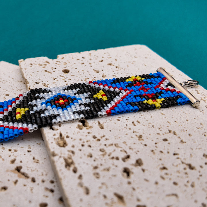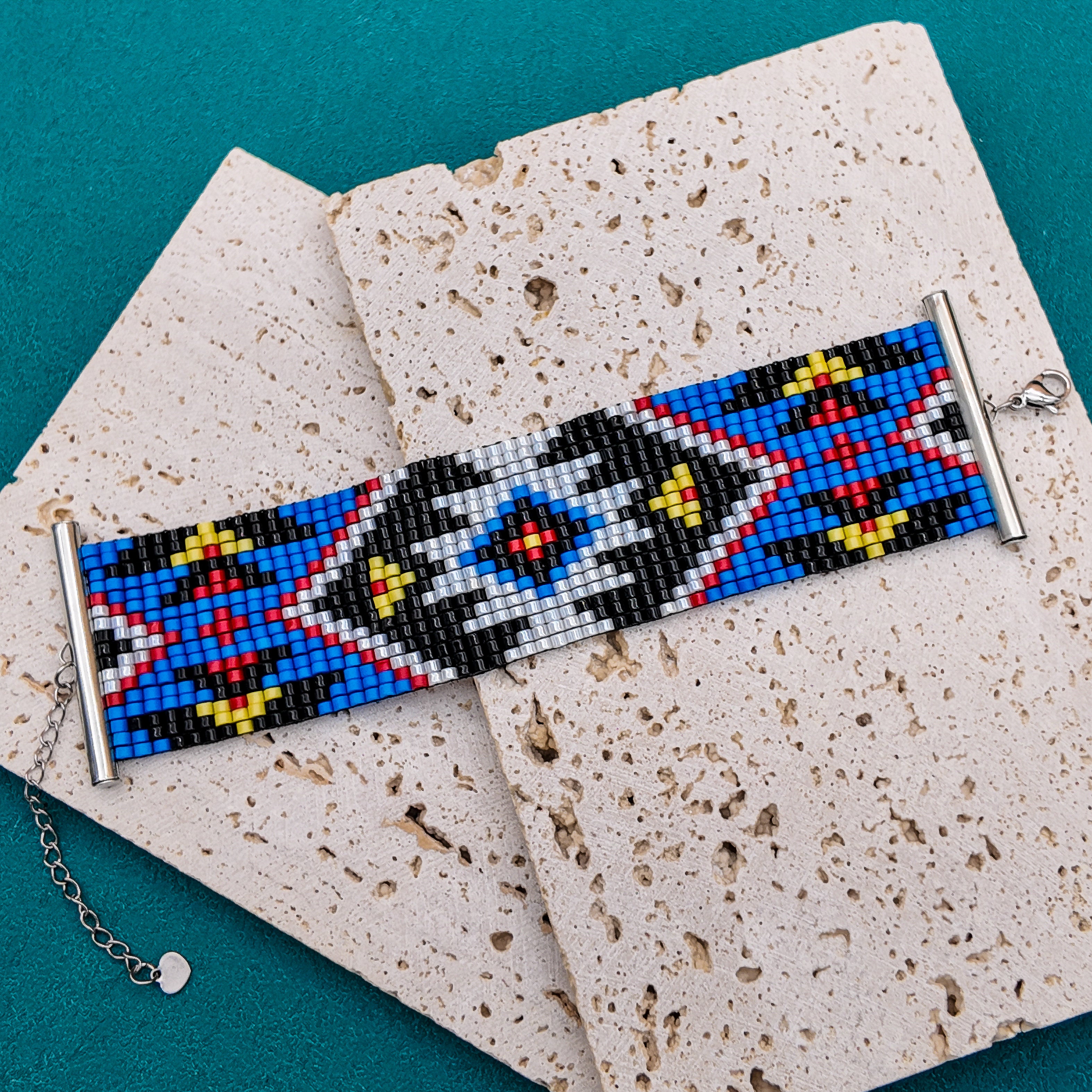 “Sky Pulse” is a signal from above — lightning stitched into pattern, energy caught in color. With striking cobalt blue, bright yellow, crimson red, and crisp white framed in deep black, each bead marks a beat in a rhythm that spans sky, signal, and story.