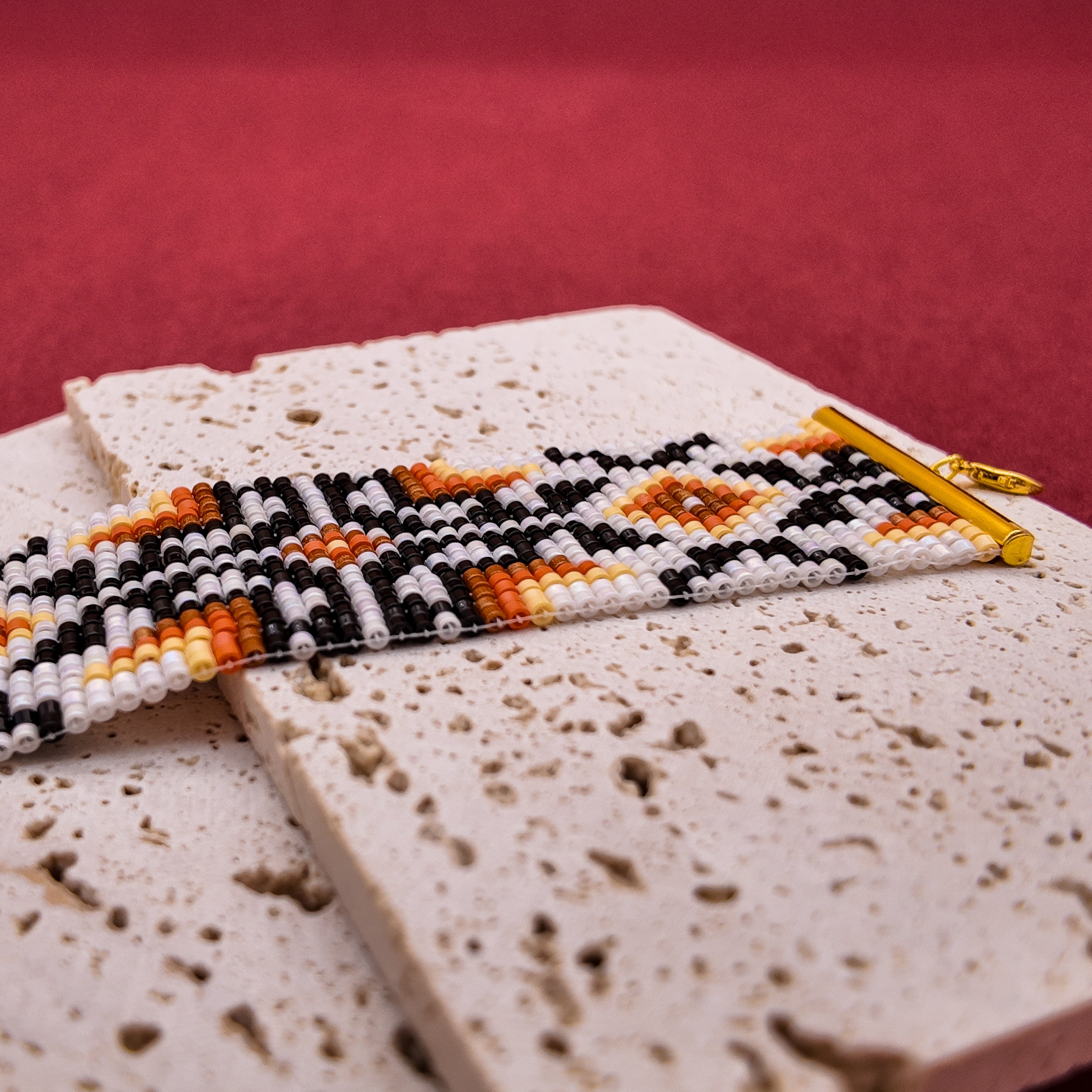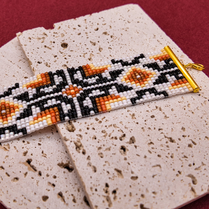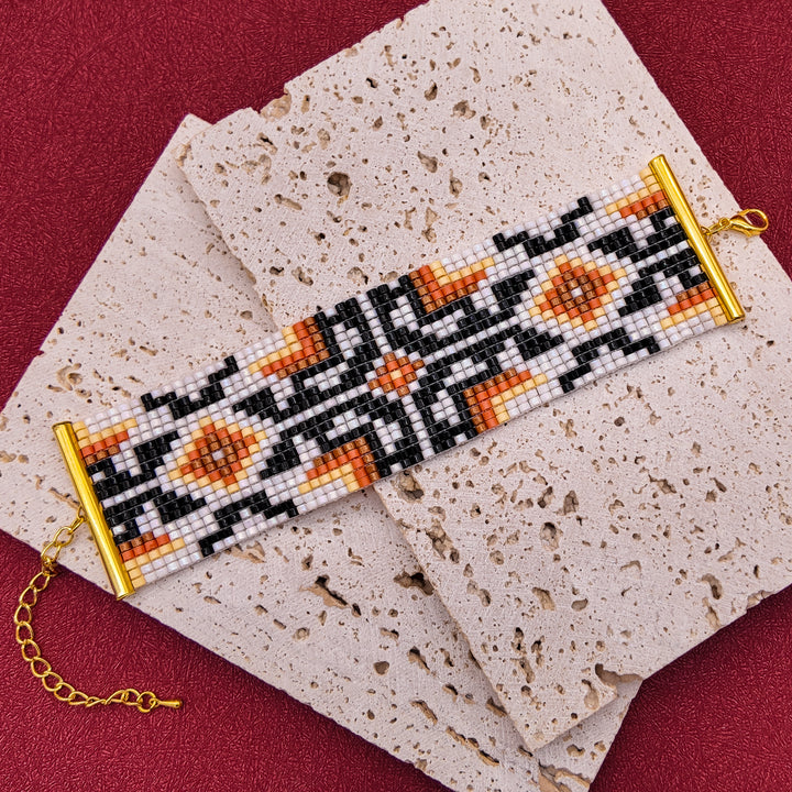 “Solar Mark” is fire etched in pattern — a one-of-a-kind bracelet glowing with strength and rhythm. With vivid bursts of orange and gold framed by black and white symmetry, each bead carries the essence of light carved into balance and timeless design.