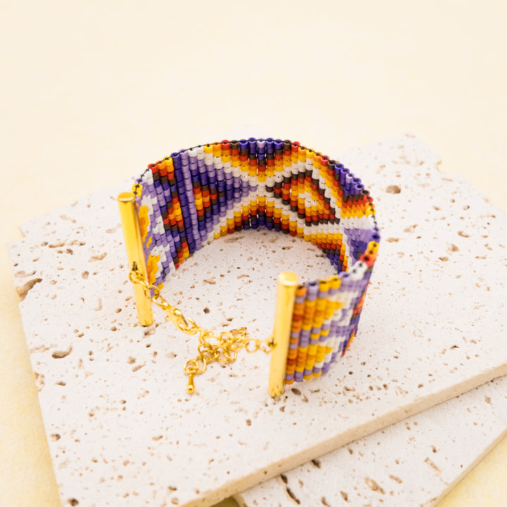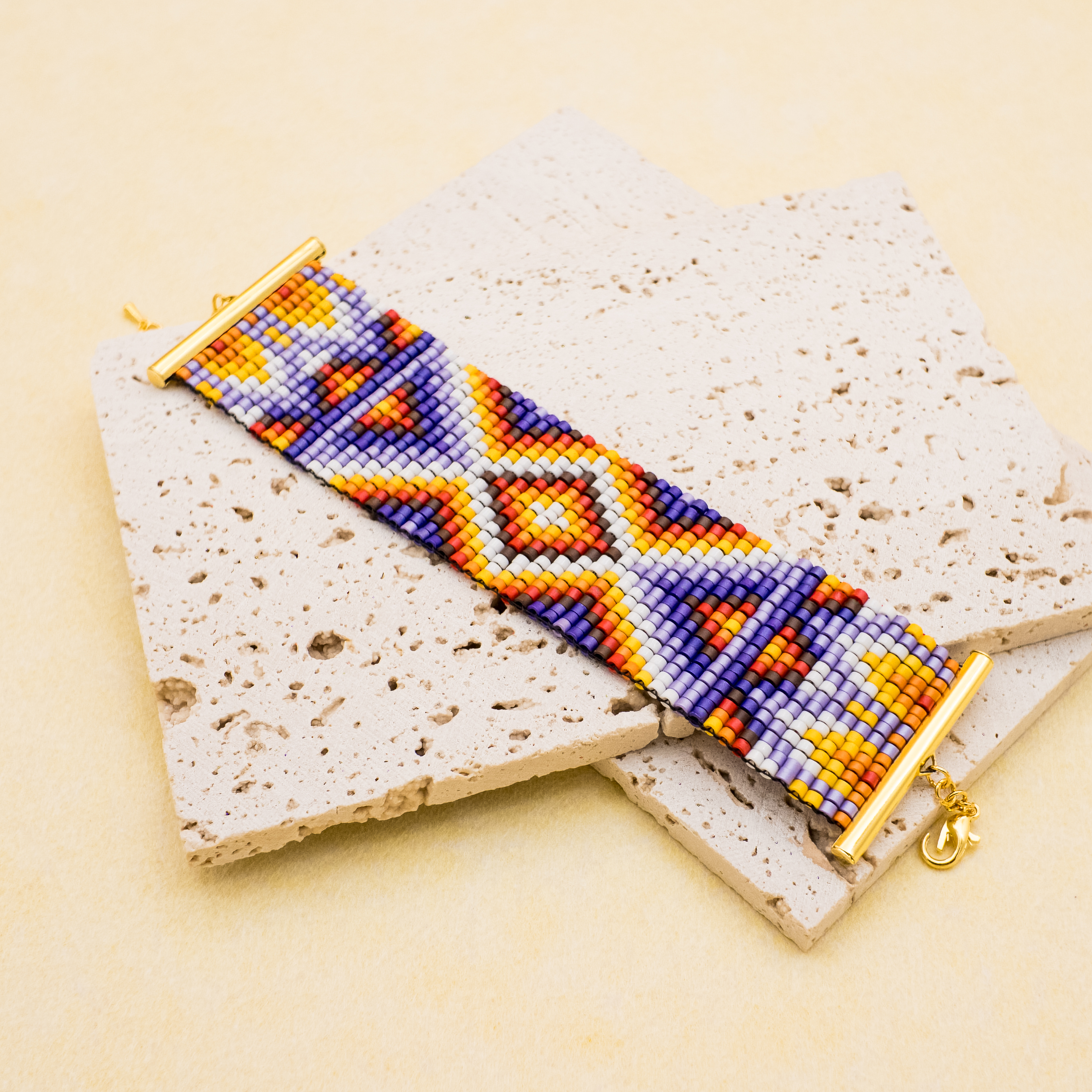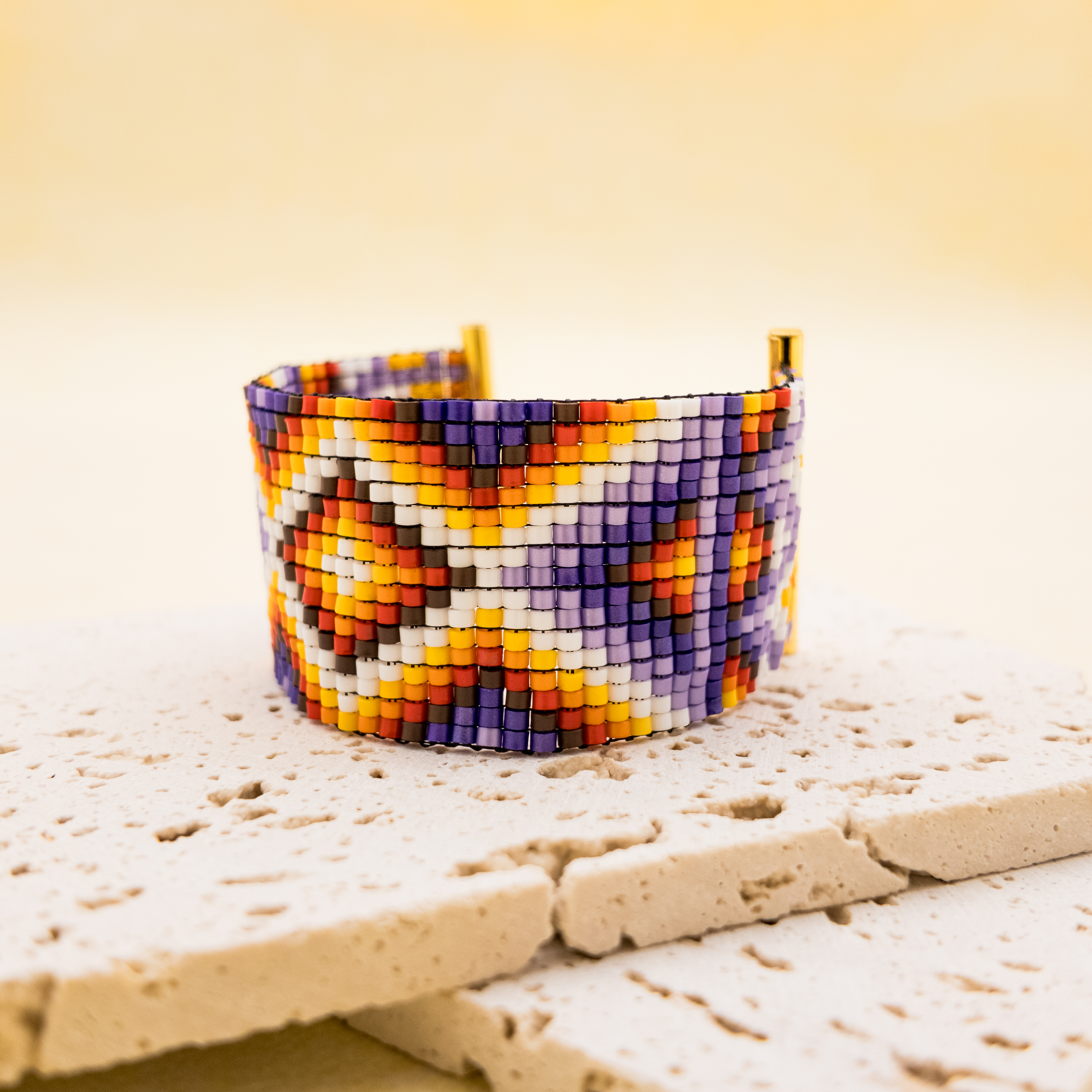 “Solar Rhythm” is woven from motion — every line and color chosen to move like a heartbeat under heat. The vivid orange, red, and yellow beads radiate across a field of violet and white, forming a vibrant zigzag of rhythm and warmth.