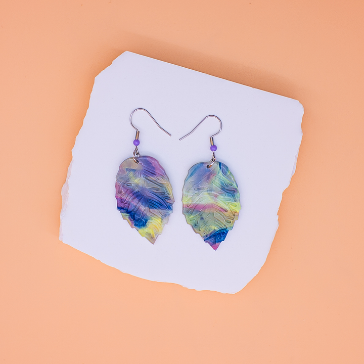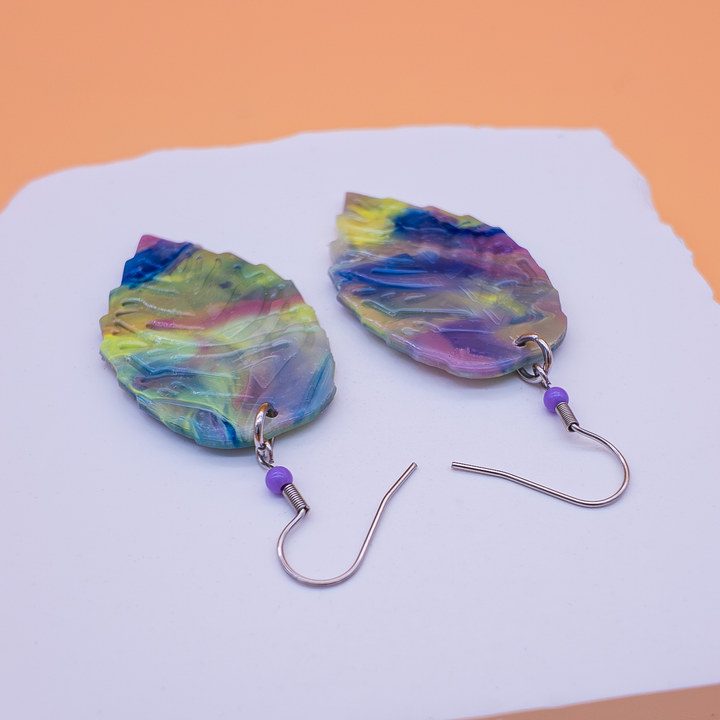 “Solar Vein” earrings are inspired by leaves kissed by shifting light — a reminder that nature’s smallest details carry the brilliance of entire skies. Their surface glows with bands of violet, yellow, turquoise, and green, echoing the layered colors of sunrise breaking through a forest canopy.