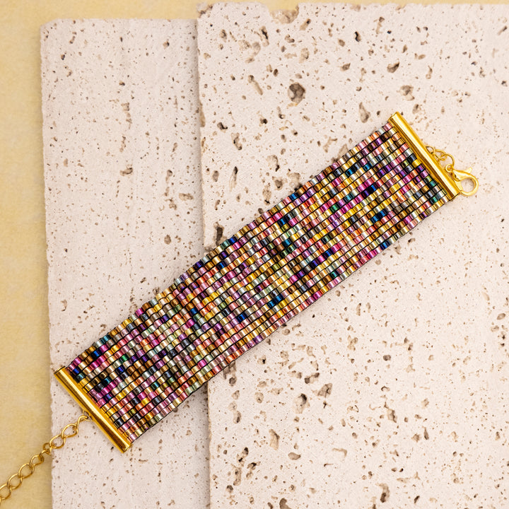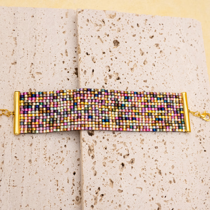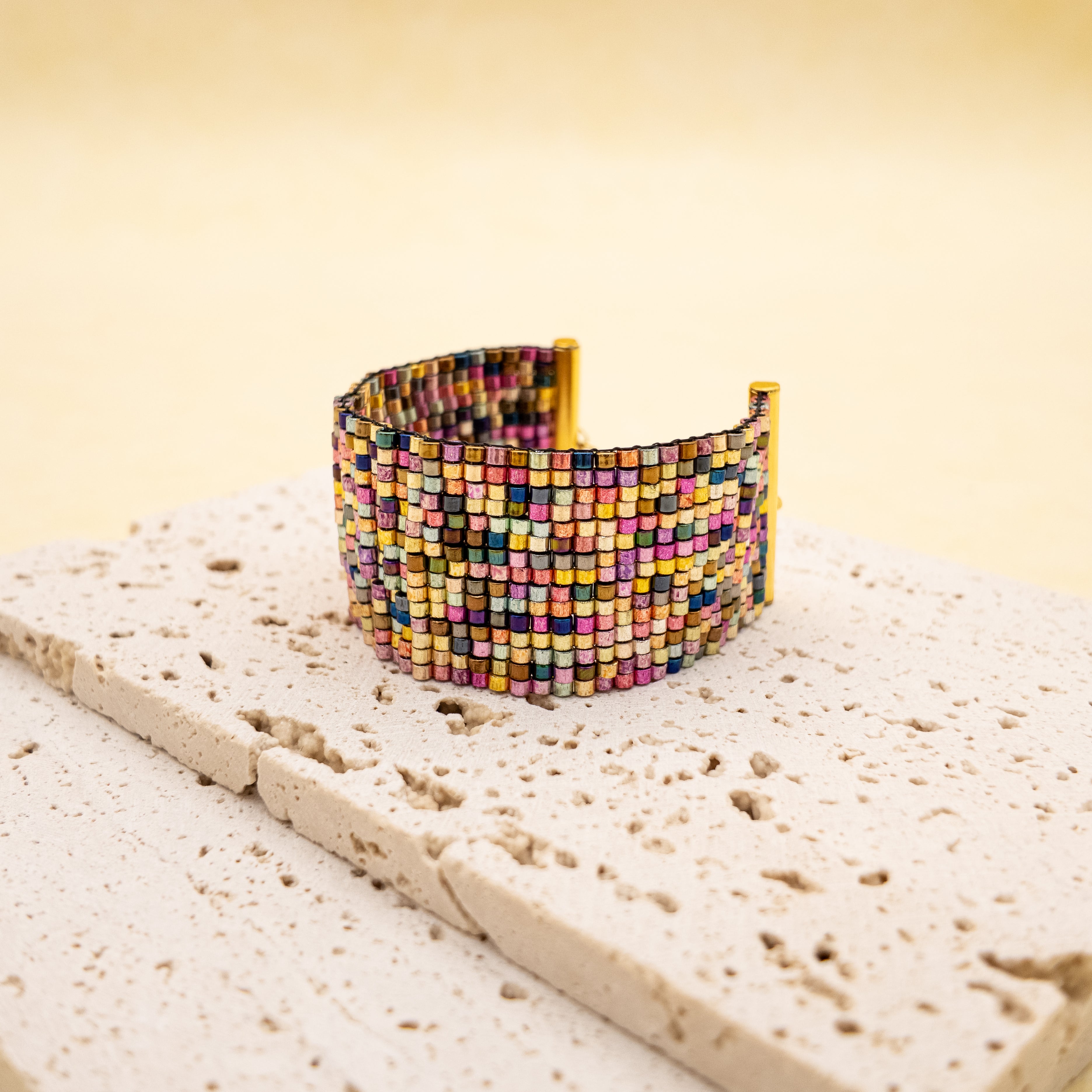 “Spectrum Cosmos” is a burst of energy captured in wearable form — a universe of tiny, glinting beads that shimmer like galaxies colliding. There is no pattern to tame, no line to follow, only rhythm and freedom stitched in gold, pink, violet, emerald, and endless hues in between.