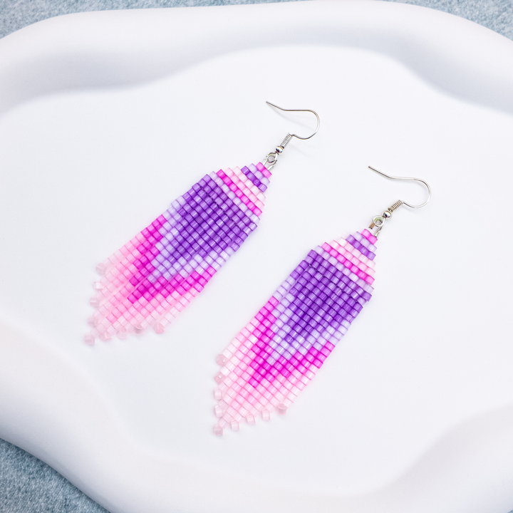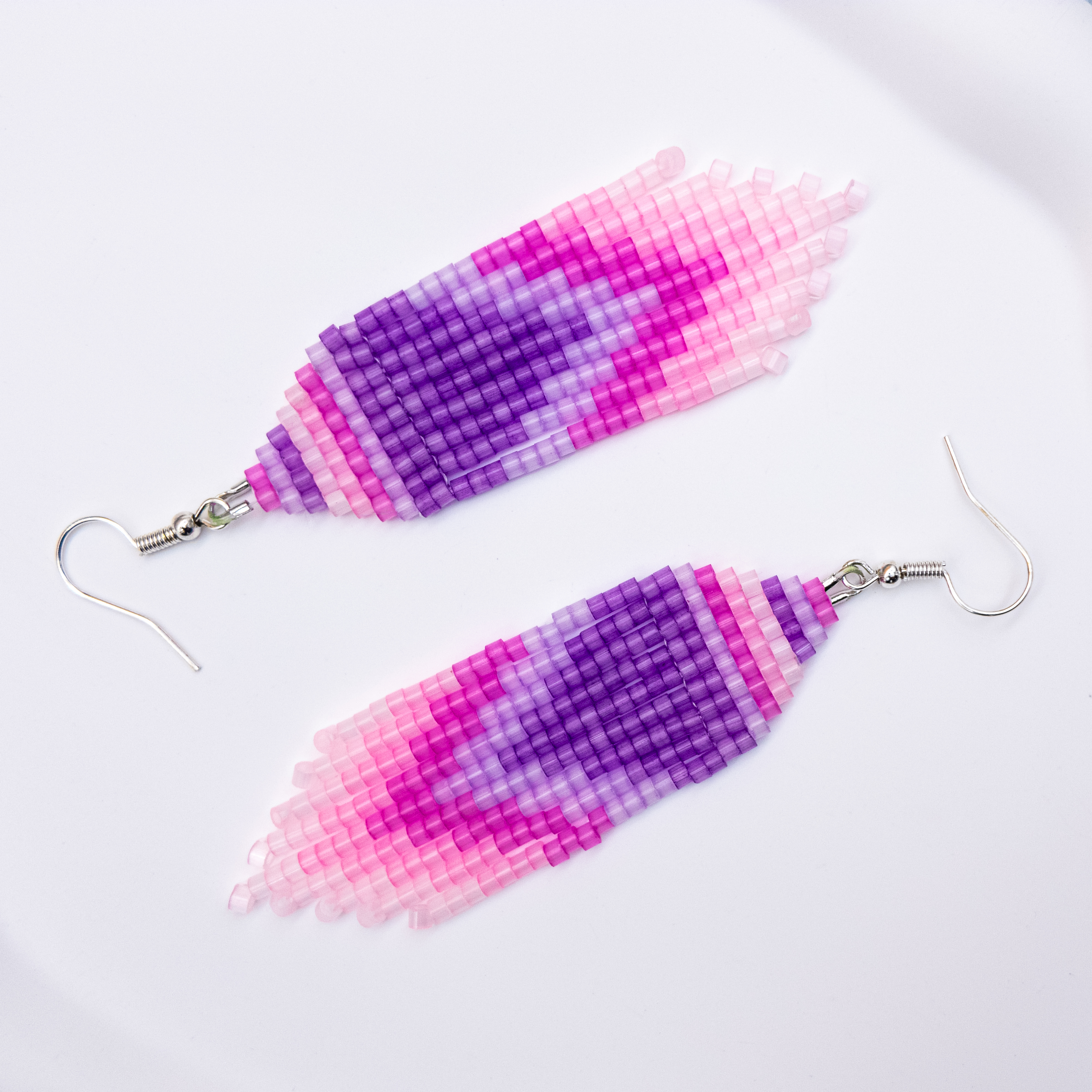 “Sugar Bloom” is a statement of sweet rebellion — precision-woven with seed beads in a dreamy ombré palette of pinks, violets, and lavender. The pointed diamond shape and gently fringed tips create a modern silhouette with nostalgic colors that nod to retro candies and pastel skies.