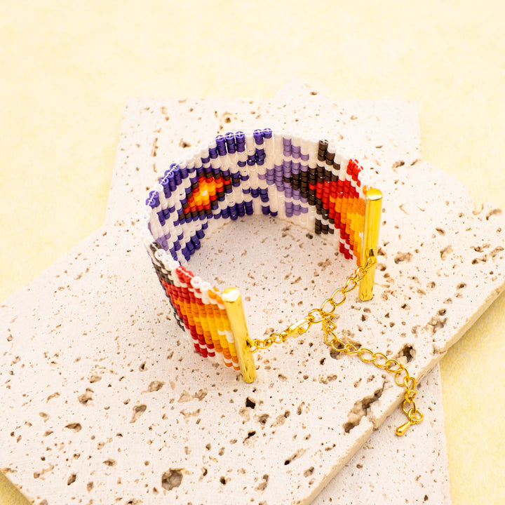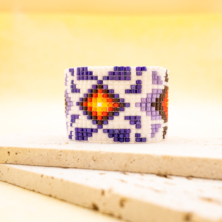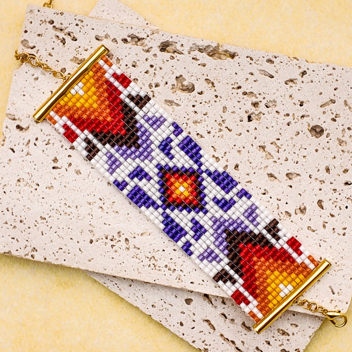 “Sunkeeper” is a tribute to heat, harmony, and the unseen power of the center. The deep violet lattice draws your eyes into the heart of the piece — a glowing sunburst rendered in reds, oranges, and yellows, surrounded by balanced geometric forms that feel ceremonial in nature.
