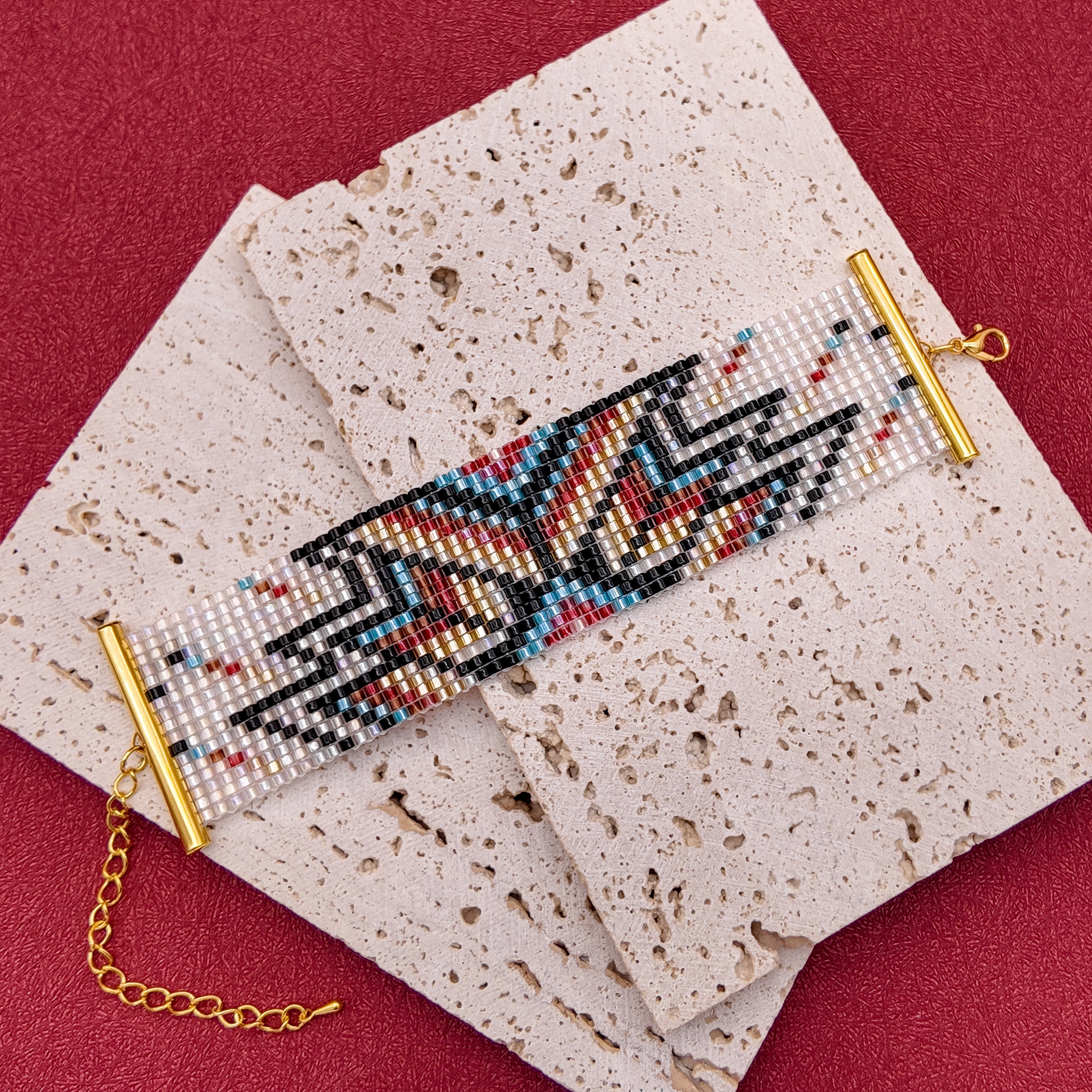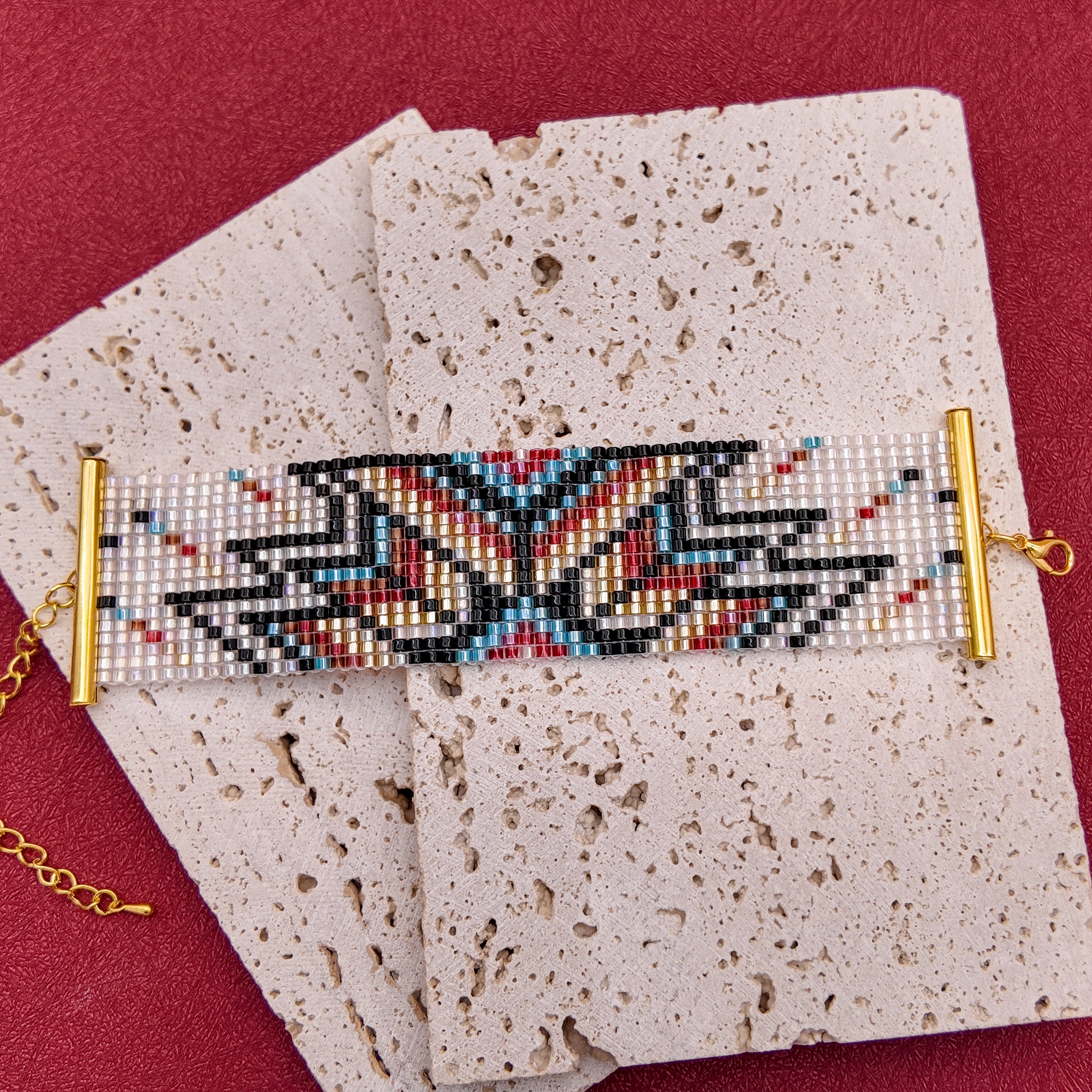“Thunder Path” is a strike of energy — a one-of-a-kind bracelet where power meets artistry. With sharp lines in black, red, turquoise, and gold set against a pearly white base, each bead forms a dynamic rhythm, like thunder carving its path across the sky.