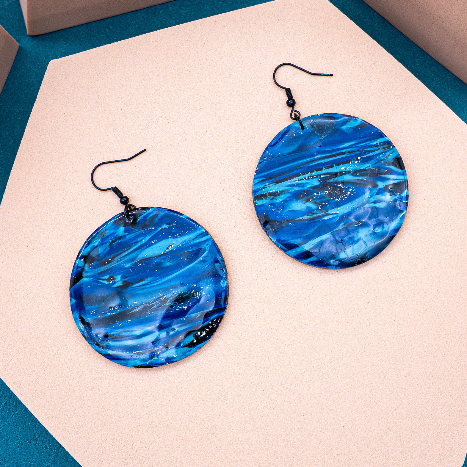 “Tidepool Galaxy” features wide, circular drops made of polymer clay in rich blue hues, accented with flecks of silver and hints of black — like stars scattered across the night sea. The high-gloss finish gives each pair a subtle glimmer, like reflections on still water.