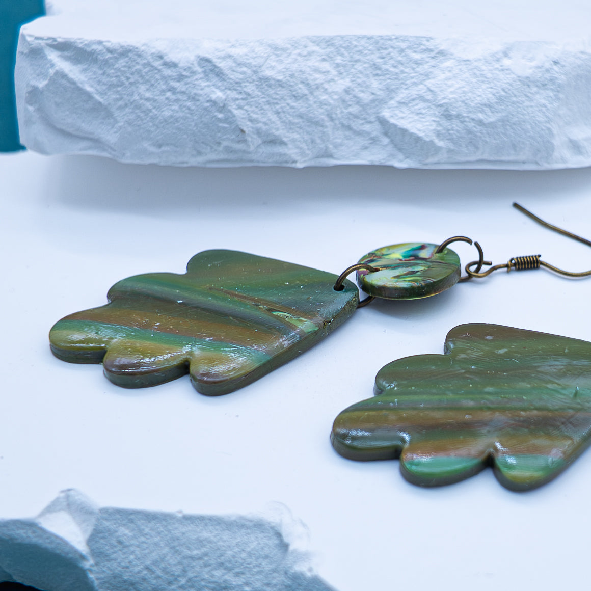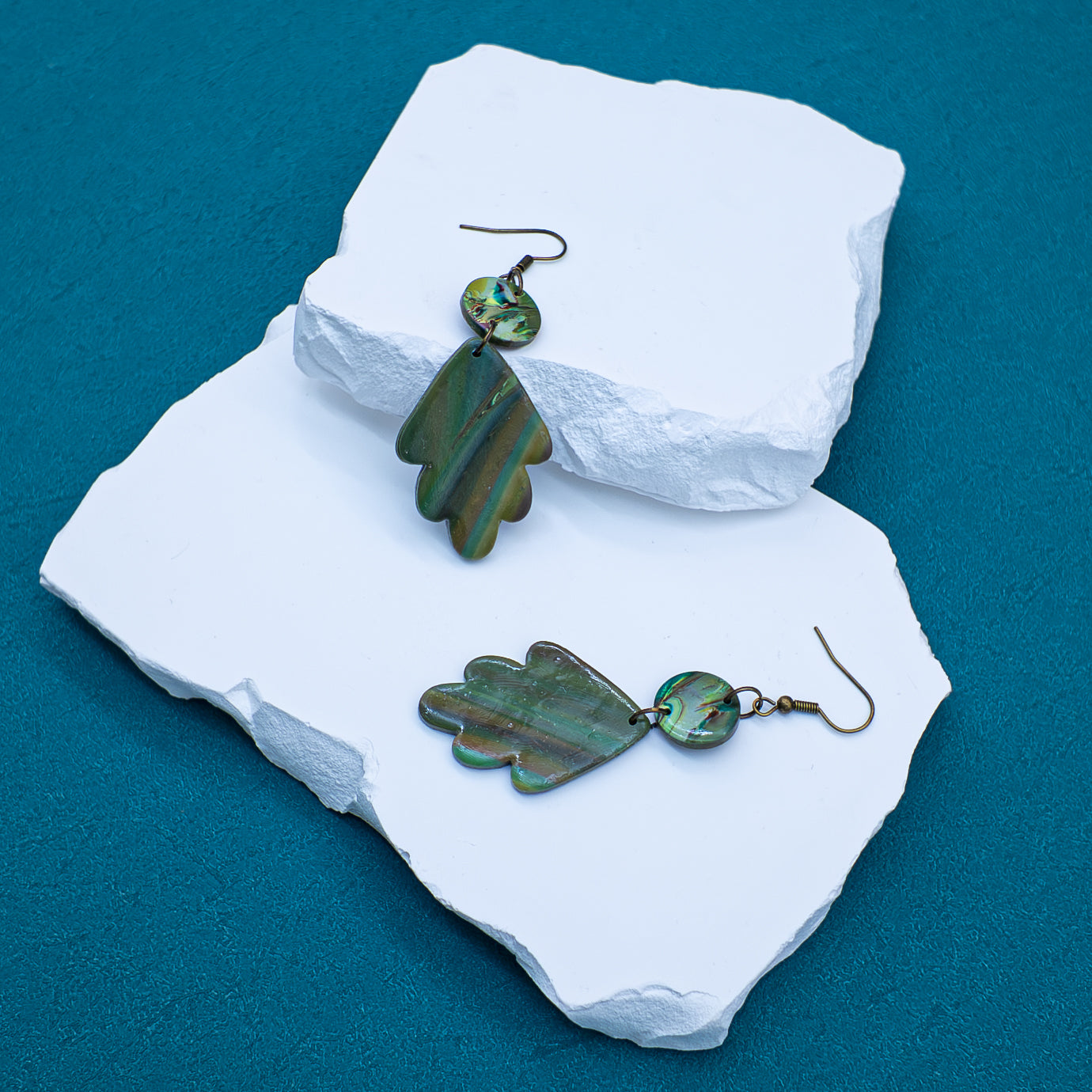 “Verdant Echo” features a leafy, fan-like silhouette in swirling tones of moss, jade, and bronze. Suspended from a marbled circular topper, these earrings bring together raw textures and muted movement — grounding you in calm with every turn of the head.