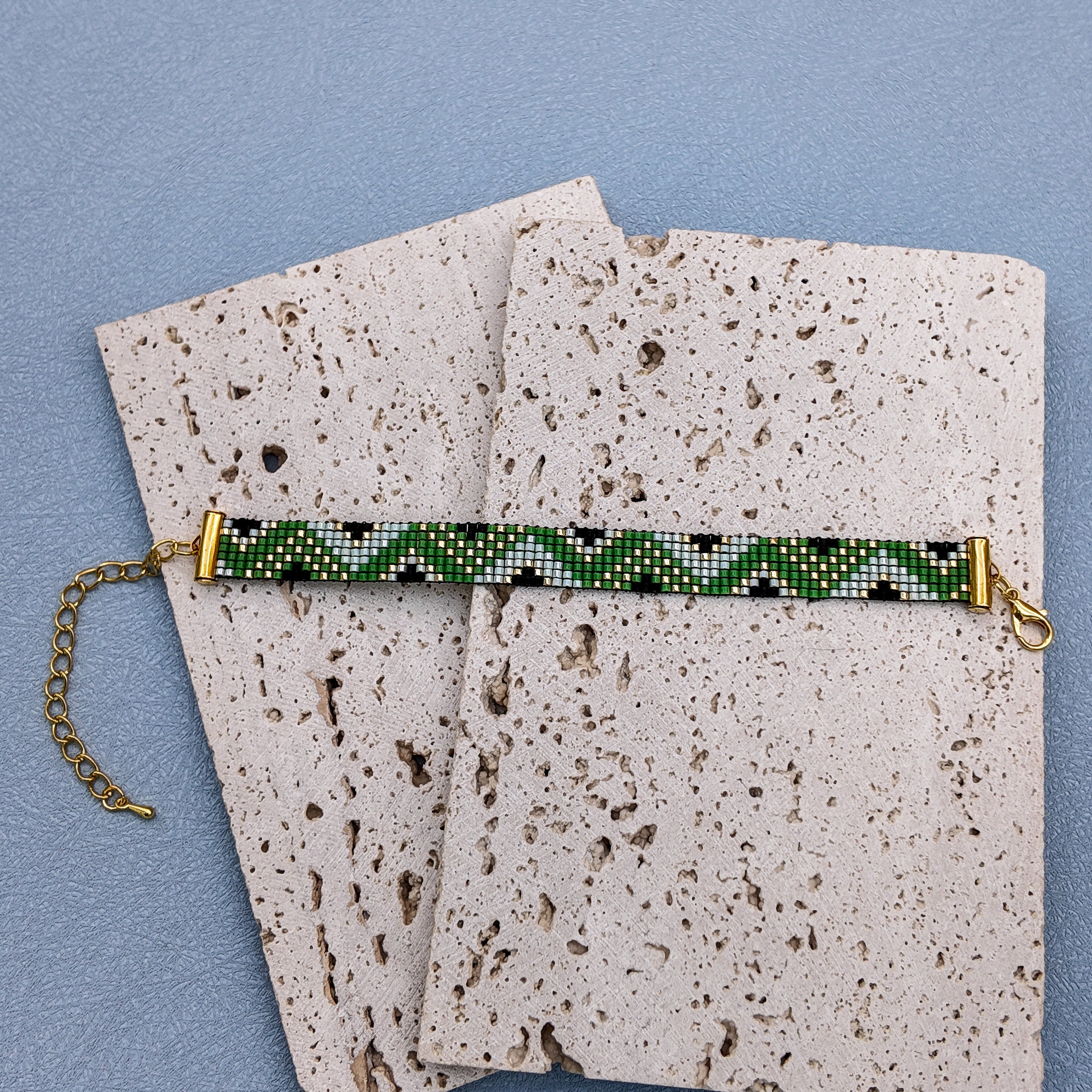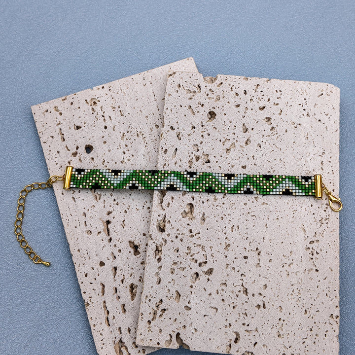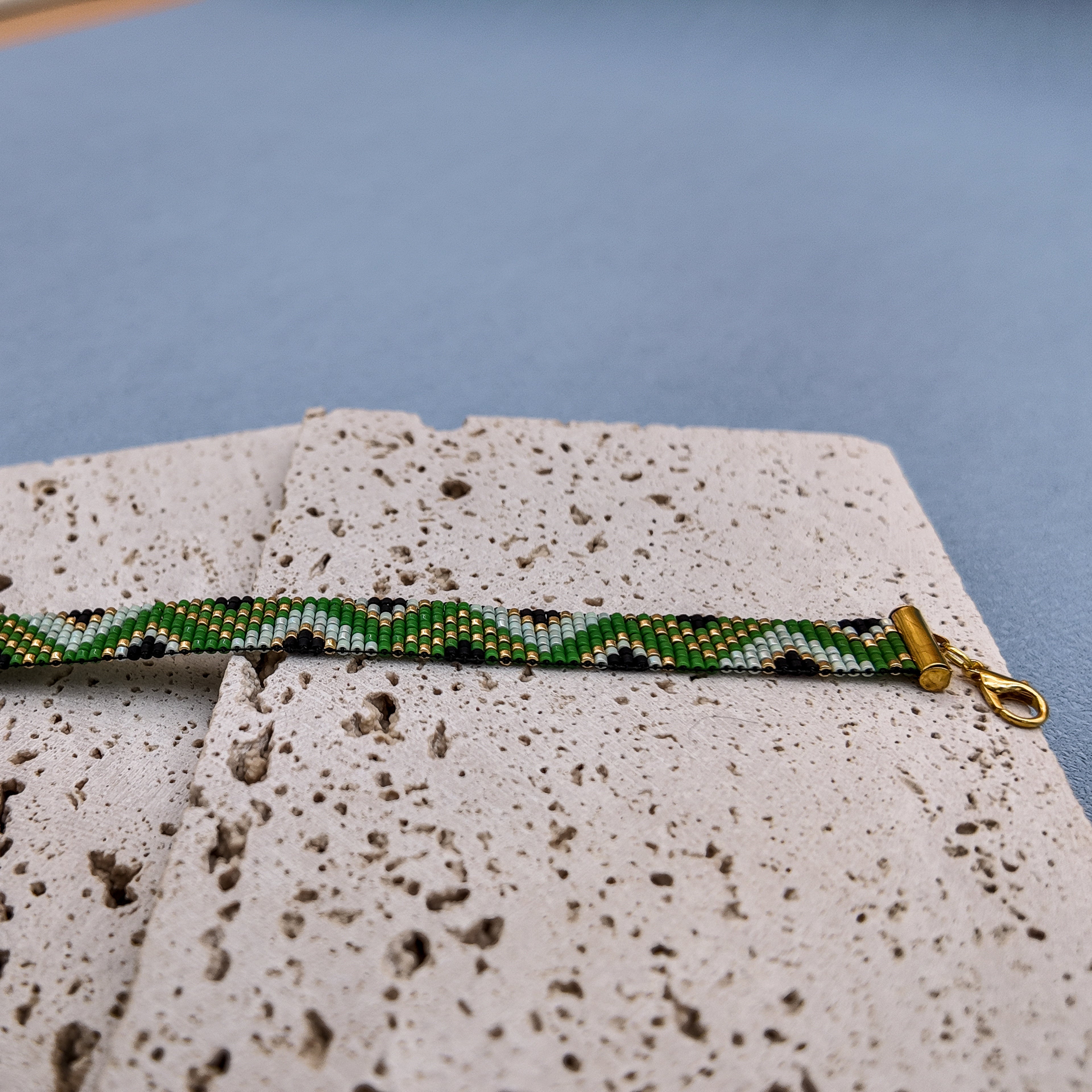 “Verdant Waves” moves with the rhythm of nature — green tones flowing like rolling hills and winding rivers. Black, white, and golden accents cut through the lush palette, creating a striking balance between earth and light. Handwoven bead by bead, this one-of-a-kind bracelet carries the spirit of renewal and growth.
