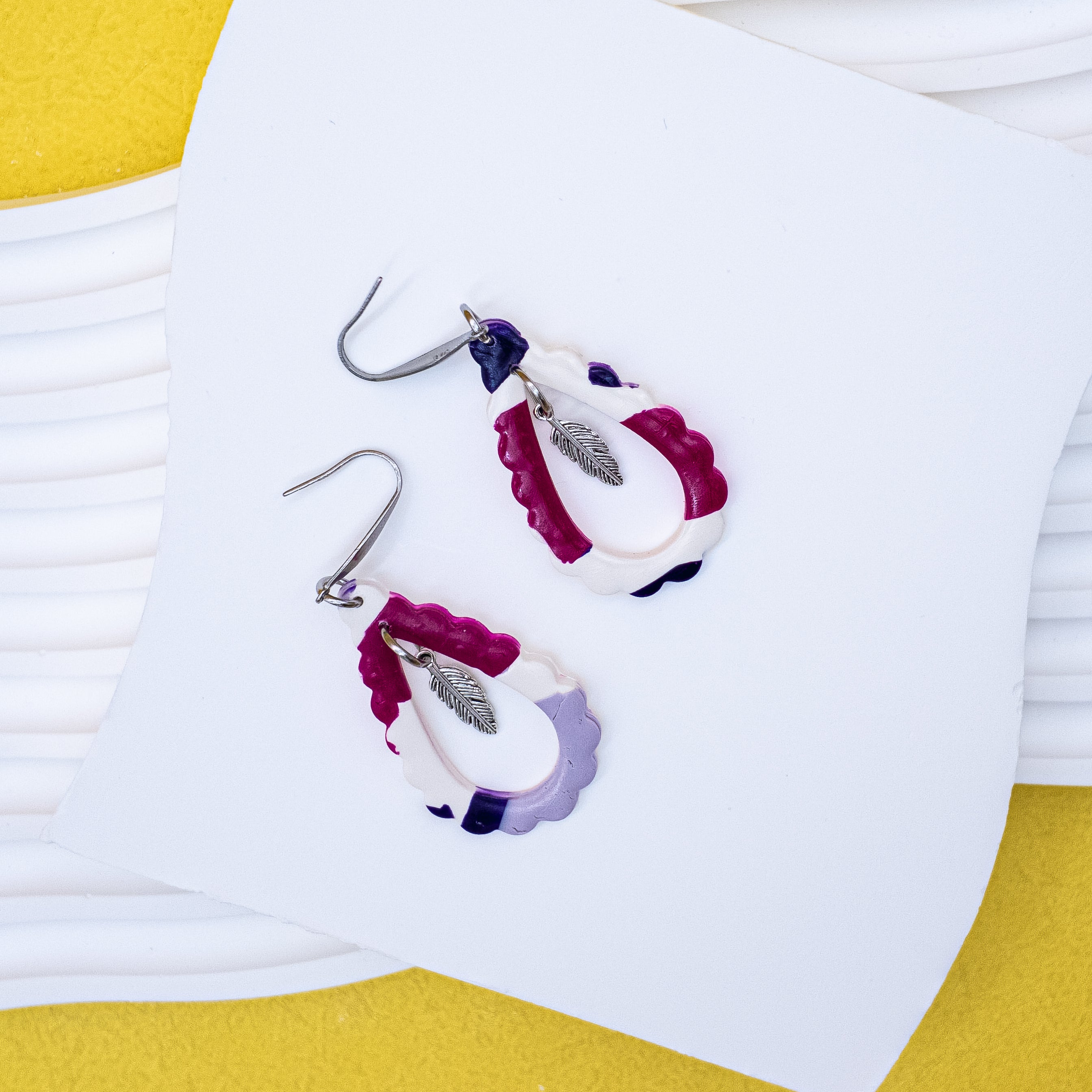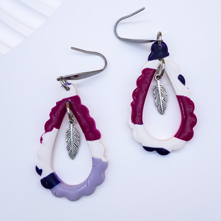 “Whisper Loop” draws its shape from the natural flow of air and voice — like a teardrop caught mid-drift. Each earring features a hand-sculpted open loop, textured with scalloped edges and dressed in swirls of berry, lavender, ivory, and ink.