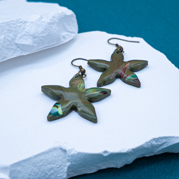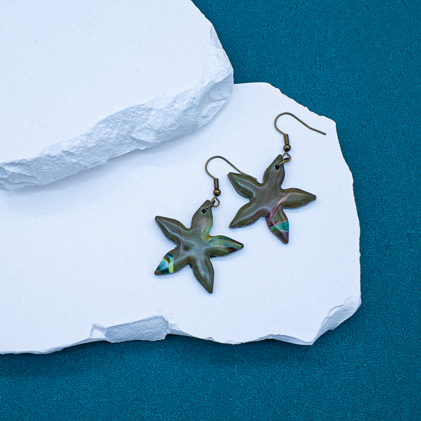 Shaped like wild ivy or a drifting starfish, “Wildcurrent” earrings bring movement and story to your look. Earthy moss green swirls with unexpected flickers of aquamarine, crimson, and ochre — a color palette that feels both grounded and alive.