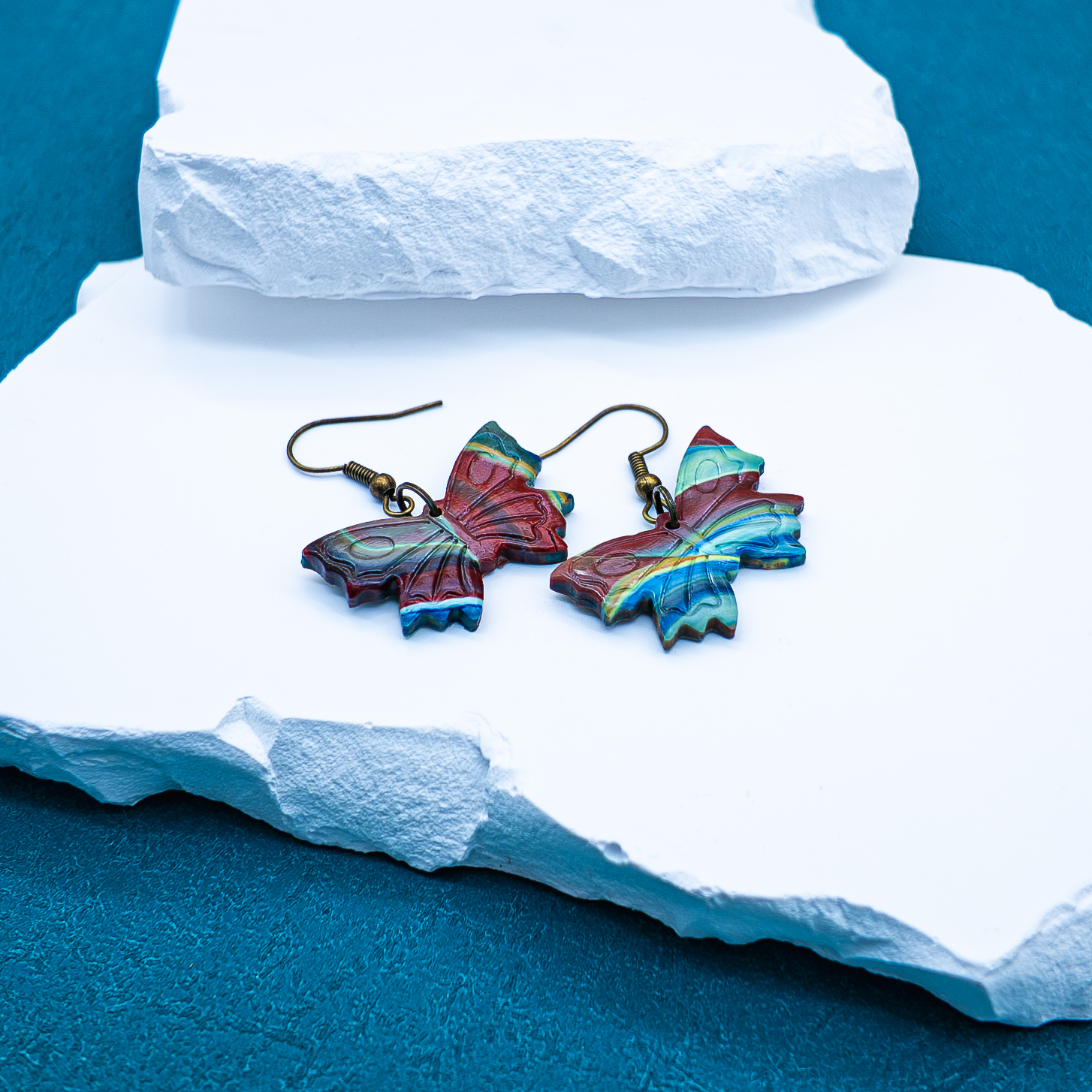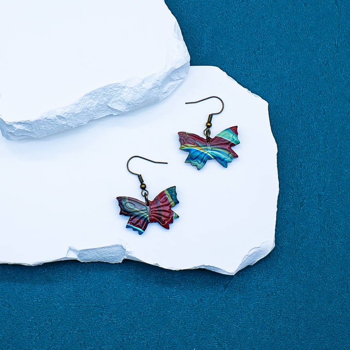 “Wingspan” is a sculptural ode to change — each butterfly cut from swirling blends of turquoise, crimson, ochre, and navy, forming organic marbled patterns as unique as flight paths. Their slightly distressed wing edges suggest a story of resilience — imperfect and beautiful.